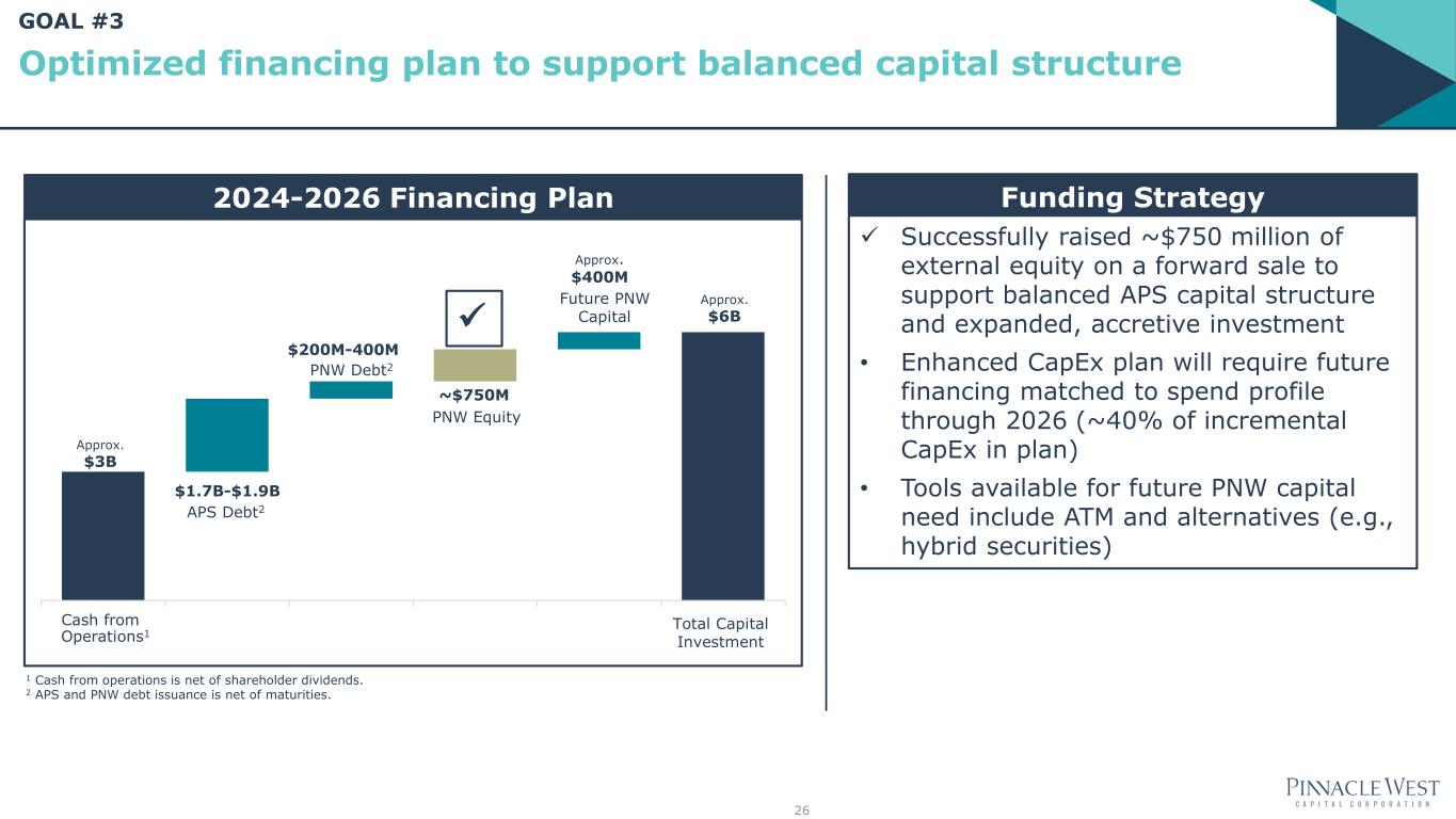 Current Approved Rate Base and Test Year Detail End-of-Year Rate Base and Growth Guidance ACC FERC Rate Effective Date 03/08/2024 6/1/2023 Test Year Ended 6/30/20221 12/31/2022 Equity Layer 51.93% 50.3% Allowed ROE 9.55% 10.75% Rate Base $10.36B2 $2.0B $9.92 $13.5 $2.01 $2.6 2022 2023 2024 2025 2026 ACC FERC 25 Rate base $ in billions, rounded Projected 1 Derived from APS annual update of formula transmission service rates. 2 Represents unadjusted ACC jurisdictional rate base consistent with regulatory filings. 1 Adjusted to include post-test year plant in service through 06/30/2023. 2 Rate Base excludes $215M approved through Joint Resolution in Case No. E-01345A-19-0236. Generation spend through System Reliability Benefit Surcharge and transmission spend will total ~35% of tracked capital from 2024-2026 and help reduce regulatory lag Rate Base growing with our service territory GOAL #2