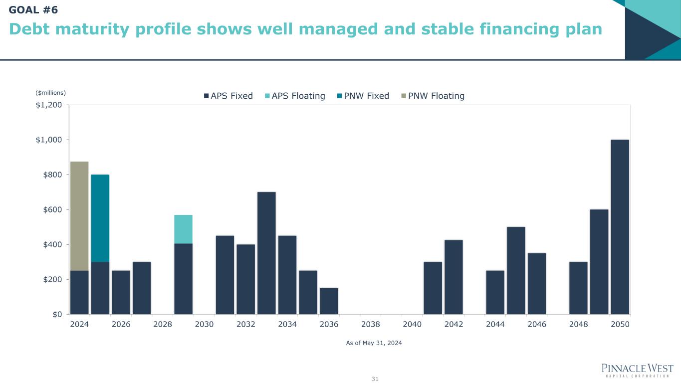 Balance Sheet Targets • Solid investment-grade credit ratings • APS equity layer >50% • PNW FFO/Debt range of 14%-16% Corporate Ratings Senior Unsecured Ratings Short-Term Ratings Outlook APS Moody’s Baa1 Baa1 P-2 Stable S&P BBB+ BBB+ A-2 Stable Fitch BBB+ A- F2 Stable Pinnacle West Moody’s Baa2 Baa2 P-2 Stable S&P BBB+ BBB A-2 Stable Fitch BBB BBB F3 Stable 30 1 We are disclosing credit ratings to enhance understanding of our sources of liquidity and the effects of our ratings on our costs of funds. Ratings are as of May 31, 2024. We are focused on maintaining healthy credit ratings to support affordable growth1 GOAL #6