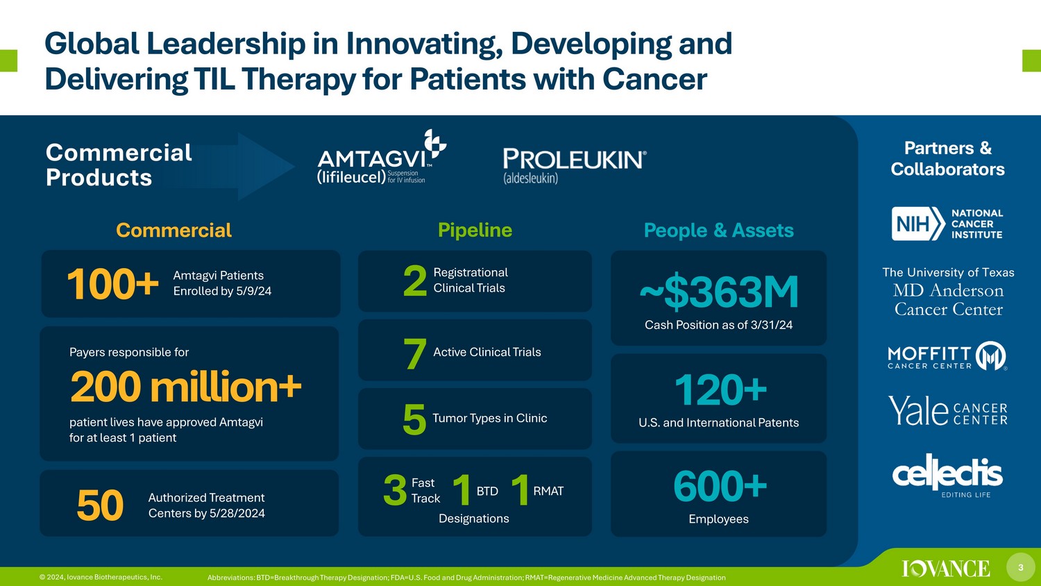 2 © 2024, Iovance Biotherapeutics, Inc. Forward - Looking Statements Certain matters discussed in this presentation are “forward - looking statements” of Iovance Biotherapeutics, Inc. (hereinafter re ferred to as the “Company,” “we,” “U.S.,” or “our”) within the meaning of the Private Securities Litigation Reform Act of 1995 (the “PSLRA”). Without limiting the foregoing, we may, in so me cases, use terms such as “predicts,” “believes,” “potential,” “continue,” “estimates,” “anticipates,” “expects,” “plans,” “intends,” “forecast,” “guidance,” “outlook,” “may,” “c ould,” “might,” “will,” “should,” or other words that convey uncertainty of future events or outcomes and are intended to identify forward - looking statements. Forward - looking stateme nts are based on assumptions and assessments made in light of management’s experience and perception of historical trends, current conditions, expected future developments, an d o ther factors believed to be appropriate. Forward - looking statements in this press release are made as of the date of this press release, and we undertake no duty to update or revise any such statements, whether as a result of new information, future events or otherwise. Forward - looking statements are not guarantees of future performance and are subject to risks, uncert ainties, and other factors, many of which are outside of our control, that may cause actual results, levels of activity, performance, achievements, and developments to be materially dif ferent from those expressed in or implied by these forward - looking statements. Important factors that could cause actual results, developments, and business decisions to differ ma terially from forward - looking statements are described in the sections titled "Risk Factors" in our filings with the U.S. Securities and Exchange Commission, including our most rec ent Annual Report on Form 10 - K and Quarterly Reports on Form 10 - Q, and include, but are not limited to, the following substantial known and unknown risks and uncertainties inherent in our business: the risks related to our ability to successfully commercialize our products, including Amtagvi and Proleukin, for which we obtain U.S. Food and Drug Administrati on (“FDA”), European Medicines Agency (“EMA”), or other regulatory authority approval; the risk that the EMA or other regulatory authorities may not approve or may delay appro val for our biologics license application (“BLA”) submission for lifileucel in metastatic melanoma; the acceptance by the market of our products, including Amtagvi and Proleukin, and the ir potential pricing and/or reimbursement by payors, if approved (in the case of our product candidates), in the U.S. and other international markets and whether such acceptance is suf ficient to support continued commercialization or development of our products, including Amtagvi and Proleukin, or product candidates, respectively; our ability or inability t o m anufacture our therapies using third party manufacturers or at our own facility may adversely affect our commercial launch; the results of clinical trials with collaborators using diffe ren t manufacturing processes may not be reflected in our sponsored trials; the risk regarding the successful integration of the recent Proleukin acquisition; the risk that the succes sfu l development or commercialization of our products, including Amtagvi and Proleukin, may not generate sufficient revenue from product sales, and we may not become profitable in the near term, or at all; the risk that future competitive or other market factors may adversely affect the commercial potential for Amtagvi or Proleukin; the risks related to the timing of and our ability to successfully develop, submit, obtain, or maintain FDA, EMA, or other regulatory authority approval of, or other action with respect to, our product candidates; whethe r c linical trial results from our pivotal studies and cohorts, and meetings with the FDA, EMA, or other regulatory authorities may support registrational studies and subsequent approvals b y t he FDA, EMA, or other regulatory authorities, including the risk that the planned single arm Phase 2 IOV - LUN - 202 trial may not support registration; preliminary and interim clinical re sults, which may include efficacy and safety results, from ongoing clinical trials or cohorts may not be reflected in the final analyses of our ongoing clinical trials or subgroups wit hin these trials or in other prior trials or cohorts; the risk that enrollment may need to be adjusted for our trials and cohorts within those trials based on FDA and other regulatory agency in put ; the risk that the changing landscape of care for cervical cancer patients may impact our clinical trials in this indication; the risk that we may be required to conduct additional cli nic al trials or modify ongoing or future clinical trials based on feedback from the FDA, EMA, or other regulatory authorities; the risk that our interpretation of the results of our clinical tri als or communications with the FDA, EMA, or other regulatory authorities may differ from the interpretation of such results or communications by such regulatory authorities (including fr om our prior meetings with the FDA regarding our non - small cell lung cancer clinical trials); the risk that clinical data from ongoing clinical trials of Amtagvi will not continue or b e r epeated in ongoing or planned clinical trials or may not support regulatory approval or renewal of authorization; the risk that unanticipated expenses may decrease our estimated cash balance s a nd forecasts and increase our estimated capital requirements; the effects of the COVID - 19 pandemic; and other factors, including general economic conditions and regulatory deve lopments, not within our control.