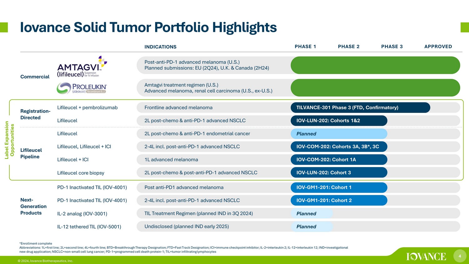 3 © 2024, Iovance Biotherapeutics, Inc. Global Leadership in Innovating, Developing and Delivering TIL Therapy for Patients with Cancer Partners & Collaborators 3 © 2024, Iovance Biotherapeutics, Inc. Commercial Products Abbreviations: BTD=Breakthrough Therapy Designation; FDA=U.S. Food and Drug Administration; RMAT=Regenerative Medicine Advanc ed Therapy Designation The University of Texas MD Anderson Cancer Center Commercial Pipeline People & Assets 50 Payers responsible for 200 million+ patient lives have approved Amtagvi for at least 1 patient 100+ ~$363M Cash Position as of 3/31/24 120+ U.S. and International Patents 600+ Employees 3 1 1 Designations Fast Track BTD RMAT Active Clinical Trials 7 Tumor Types in Clinic 5 Registrational Clinical Trials 2 Authorized Treatment Centers by 5/28/2024 Amtagvi Patients Enrolled by 5/9/24
