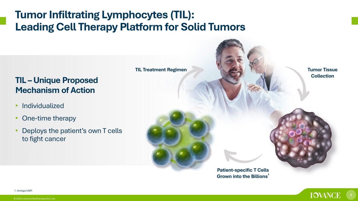 4 © 2024, Iovance Biotherapeutics, Inc. Iovance Solid Tumor Portfolio Highlights *Enrollment complete Abbreviations: 1L=first line; 2L=second line; 4L=fourth line; BTD=Breakthrough Therapy Designation; FTD=Fast Track Designatio n; ICI=immune checkpoint inhibitor; IL - 2=interleukin 2; IL - 12=interleukin 12; IND=investigational new drug application; NSCLC=non - small cell lung cancer; PD - 1=programmed cell death protein - 1; TIL=tumor infiltrating lymphocytes Label Expansion Opportunities INDICATIONS PHASE 1 PHASE 2 PHASE 3 APPROVED Commercial Post - anti - PD - 1 advanced melanoma (U.S.) Planned submissions: EU (2Q24), U.K. & Canada (2H24) Amtagvi treatment regimen (U.S.) Advanced melanoma, renal cell carcinoma (U.S., ex - U.S.) Registration - Directed Lifileucel + pembrolizumab Frontline advanced melanoma TILVANCE - 301 Phase 3 (FTD, Confirmatory) Lifileucel 2L post - chemo & anti - PD - 1 advanced NSCLC IOV - LUN - 202: Cohorts 1&2 Lifileucel Pipeline Lifileucel 2L post - chemo & anti - PD - 1 endometrial cancer Planned Lifileucel, Lifileucel + ICI 2 - 4L incl. post - anti - PD - 1 advanced NSCLC IOV - COM - 202: Cohorts 3A, 3B*, 3C Lifileucel + ICI 1L advanced melanoma IOV - COM - 202: Cohort 1A Lifileucel core biopsy 2L post - chemo & post - anti - PD - 1 advanced NSCLC IOV - LUN - 202: Cohort 3 Next - Generation Products PD - 1 Inactivated TIL (IOV - 4001) Post anti - PD1 advanced melanoma IOV - GM1 - 201: Cohort 1 PD - 1 Inactivated TIL (IOV - 4001) 2 - 4L incl. post - anti - PD - 1 advanced NSCLC IOV - GM1 - 201: Cohort 2 IL - 2 analog (IOV - 3001) TIL Treatment Regimen (planned IND in 3Q 2024) Planned IL - 12 tethered TIL (IOV - 5001) Undisclosed (planned IND early 2025) Planned
