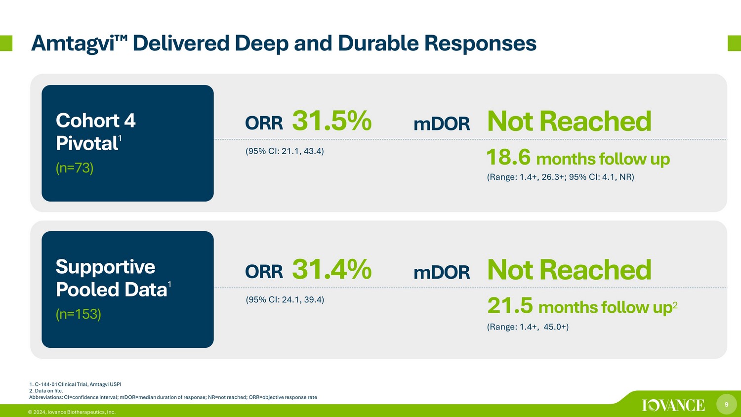 8 © 2024, Iovance Biotherapeutics, Inc. U.S. Metastatic Melanoma Patient Population More than half of patients progress within 12 months on current 1L ICIs , regardless of BRAF mutation status 3 Amtagvi ¯ is preferred second - line or subsequent therapy in National Comprehensive Cancer Network® (NCCN) guidelines for treatment of cutaneous melanoma 9.9K 6.3K 4.8K 1L 2L 3L-4L U.S. Melanoma Drug - Treated Population in 2021 Unresectable / Metastatic 1 Abbreviations: 1L=first line therapy, 2L=second line therapy, 3L=third line therapy; 4L=fourth line therapy; ICI=immune check poi nt inhibitor ~13 k Estimated eligible advanced melanoma patients per year in U.S. 1 8k Annual deaths in U.S. 2 1. Clarivate DRG Disease Landscape (2021) 2. National Cancer Institute Surveillance, Epidemiology and End Results (SEER) Program. 2024 Estimates. https://seer.cancer.gov accessed May 2024 3. Larkin et al, NEJM 2019; Robert et al, Lancet Oncology 2019; Tawbi et al, NEJM 2022