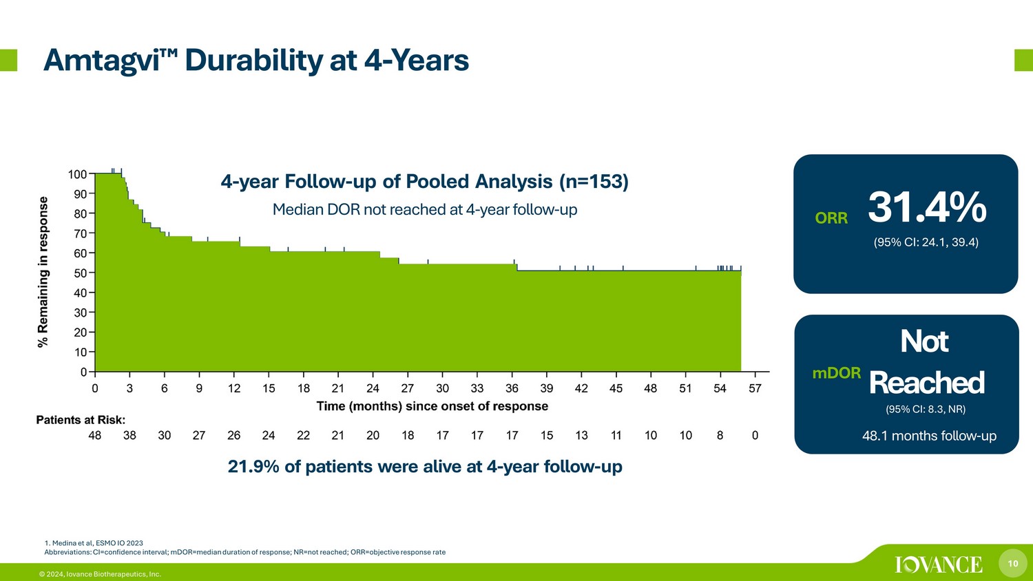 9 © 2024, Iovance Biotherapeutics, Inc. Amtagvi ¯ Delivered Deep and Durable Responses (95% CI: 21.1, 43.4) mDOR Not Reached ORR 31.4 % (95% CI: 24.1, 39.4) (Range: 1.4+, 45.0+) (Range: 1.4+, 26.3+; 95% CI: 4.1, NR) 18.6 months follow up 21.5 months follow up 2 1. C - 144 - 01 Clinical Trial, Amtagvi USPI 2. Data on file. Abbreviations: CI=confidence interval; mDOR = median duration of response; NR = not reached; ORR=objective response rate Cohort 4 Pivotal 1 (n=73) Supportive Pooled Data 1 (n=153) mDOR Not Reached ORR 31. 5 %