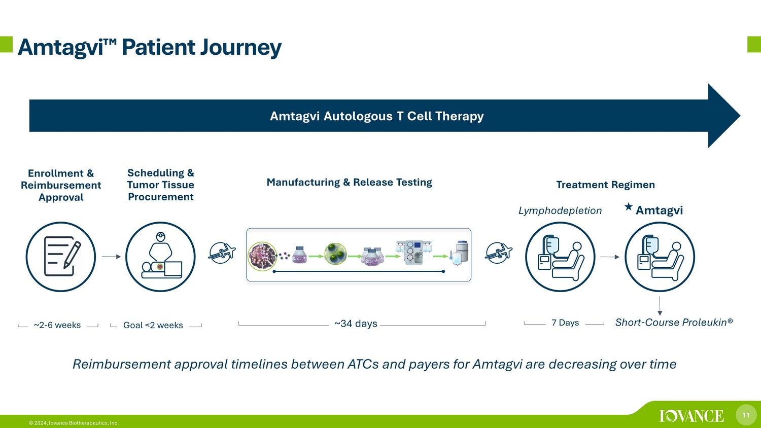 10 © 2024, Iovance Biotherapeutics, Inc. Amtagvi ¯ Durability at 4 - Years Median DOR not reached at 4 - year follow - up 4 - year Follow - up of Pooled Analysis (n=153) 31.4% (95% CI: 24.1, 39.4) ORR Not Reached (95% CI: 8.3, NR) mDOR 48.1 months follow - up 21.9% of patients were alive at 4 - year follow - up 1. Medina et al, ESMO IO 2023 Abbreviations: CI=confidence interval; mDOR = median duration of response; NR = not reached; ORR=objective response rate
