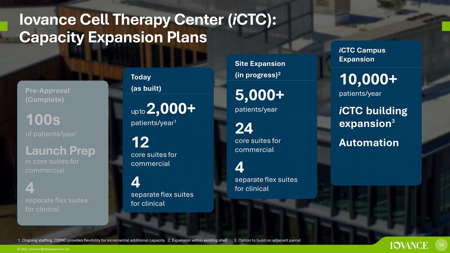 12 © 2024, Iovance Biotherapeutics, Inc. Iovance Cell Therapy Center: i CTC • Built - to - suit custom facility in Navy Yard Philadelphia • Supplies commercial and clinical TIL therapy • Annual capacity for up to several thousand patients as built • Expansion underway for additional capacity within iCTC over next few years • Control to optimize capacity, quality & COGS FDA - Approved Cell Therapy Manufacturing Facility Dedicated to Commercial and Clinical TIL Cell Therapies