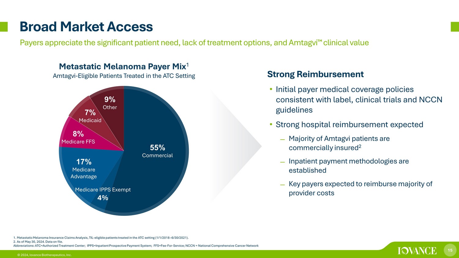 14 © 2024, Iovance Biotherapeutics, Inc. 14 Targeting Potential Authorized Treatment Centers (ATCs) 1. Amtagvi.com Note: There are at least 50 authorized treatment centers; Not all authorized treatment centers may be listed on the locator tool (Last accessed May 30, 2024) . Abbreviations: ATC=Authorized Treatment Centers; NCCN=National Comprehensive Cancer Network; KOL=Key Opinion Leaders; BMT=Bone Marrow Transplant Targeting Considerations • Patient volume • NCCN status, KOLs • Existing cell therapy / BMT • Inpatient capacity • Iovance clinical trial (s) Drive Demand • Top account prioritization • Community referrals 50 ATCs Currently Onboarded; ~70 ATCs by End of 2024 Amtagvi ¯ Authorized Treatment Centers 1