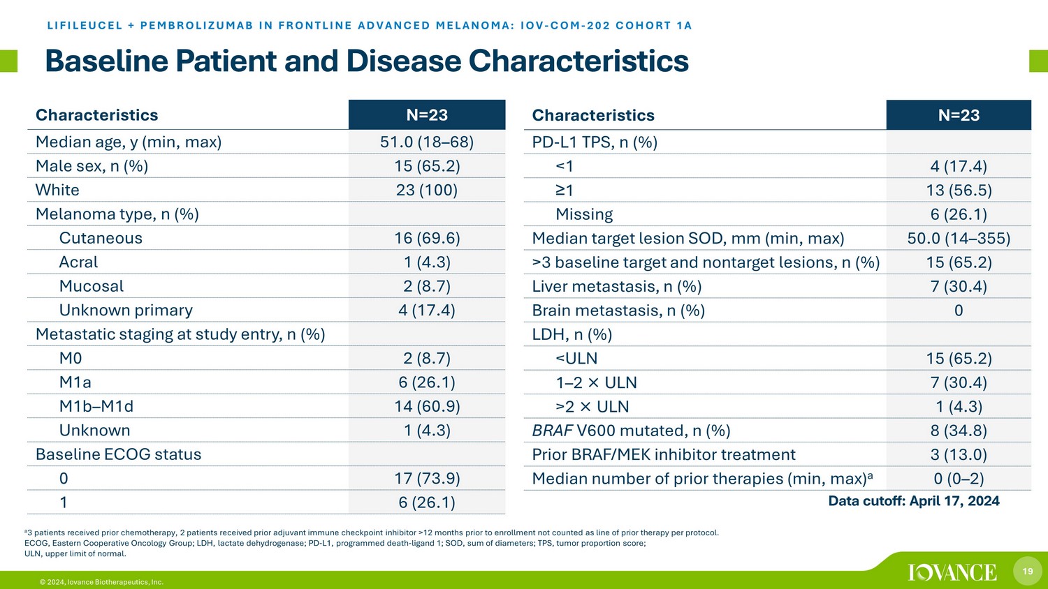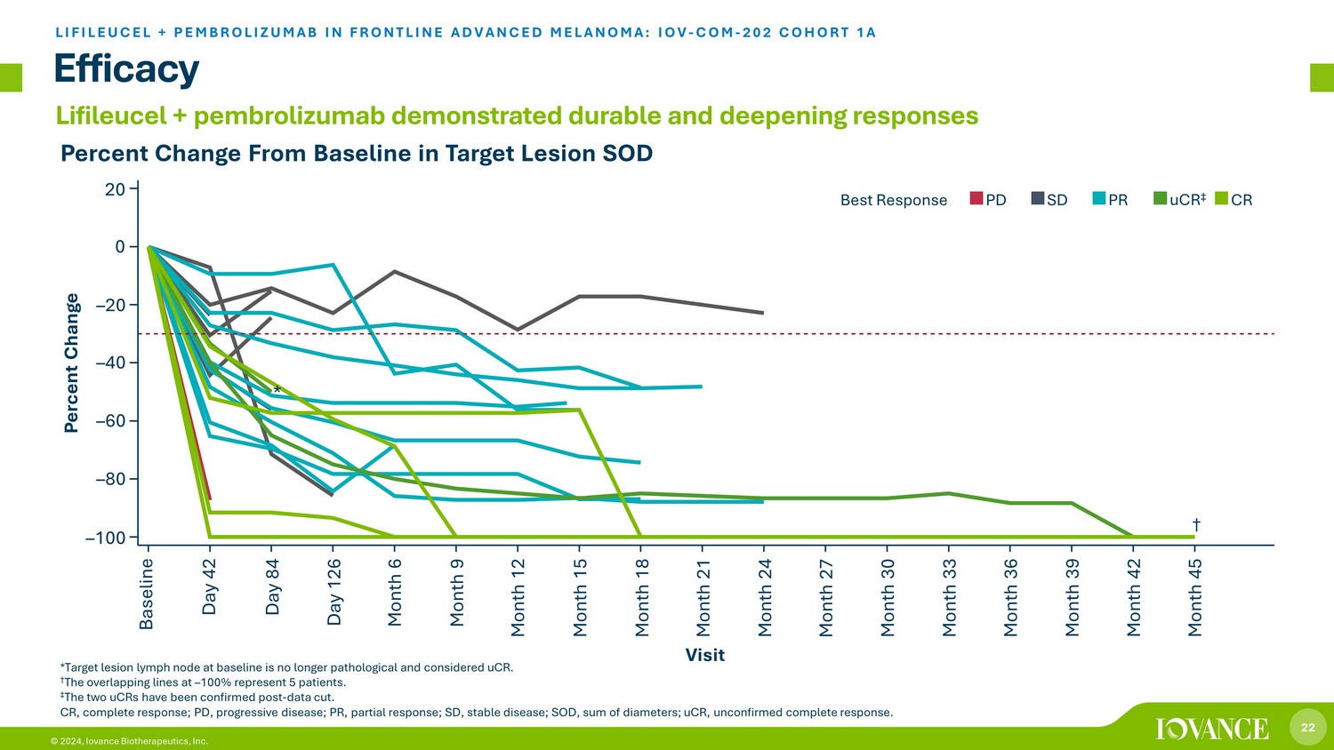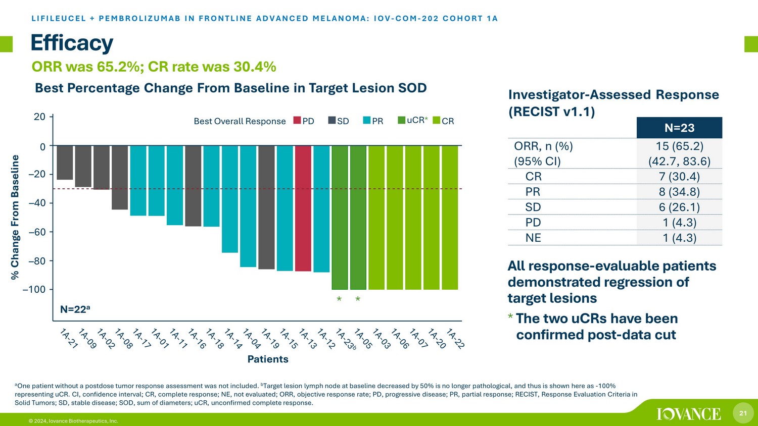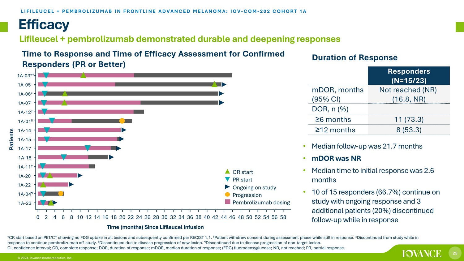 22 © 2024, Iovance Biotherapeutics, Inc. Lifileucel + pembrolizumab demonstrated durable and deepening responses Efficacy Percent Change From Baseline in Target Lesion SOD *Target lesion lymph node at baseline is no longer pathological and considered uCR. † The overlapping lines at – 100% represent 5 patients. ‡ The two uCRs have been confirmed post - data cut. CR, complete response; PD, progressive disease; PR, partial response; SD, stable disease; SOD, sum of diameters; uCR, unconfi rme d complete response. 20 0 – 20 – 40 – 60 – 80 – 100 Percent Change Baseline Day 42 Day 84 Day 126 Month 6 Month 9 Month 12 Month 15 Month 18 Month 21 Month 24 Month 27 Month 30 Month 36 Month 39 Month 42 Month 45 Month 33 Visit Best Response CR uCR ‡ PR SD PD † * LIFILEUCEL + PEMBROLIZUMAB IN FRONTLINE ADVANCED MELANOMA: IOV - COM - 202 COHORT 1A