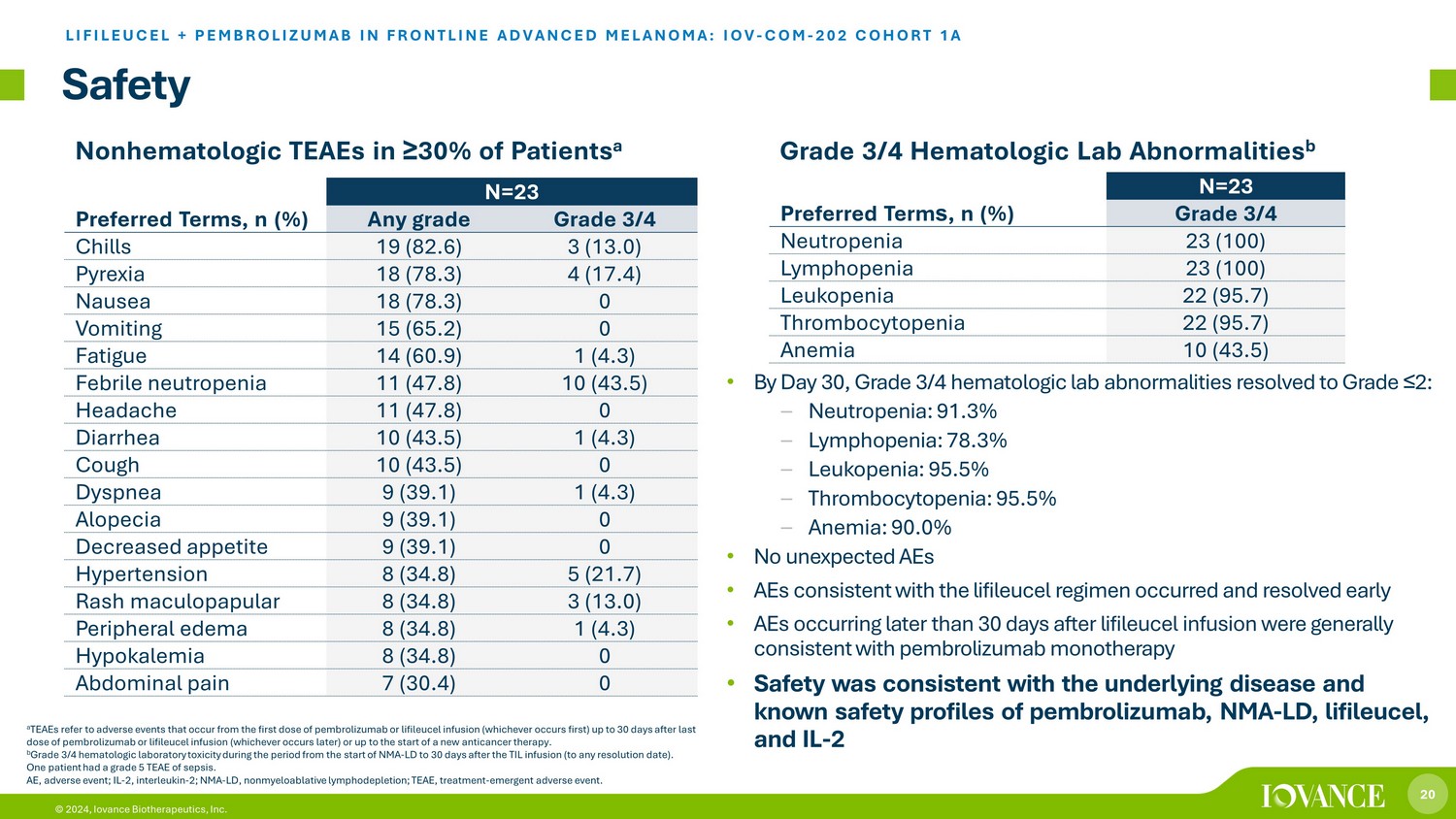 19 © 2024, Iovance Biotherapeutics, Inc. Baseline Patient and Disease Characteristics Characteristics N=23 Median age, y (min, max) 51.0 (18 – 68) Male sex, n (%) 15 (65.2) White 23 (100) Melanoma type, n (%) Cutaneous 16 (69.6) Acral 1 (4.3) Mucosal 2 (8.7) Unknown primary 4 (17.4) Metastatic staging at study entry, n (%) M0 2 (8.7) M1a 6 (26.1) M1b – M1d 14 (60.9) Unknown 1 (4.3) Baseline ECOG status 0 17 (73.9) 1 6 (26.1) a 3 patients received prior chemotherapy, 2 patients received prior adjuvant immune checkpoint inhibitor >12 months prior to en rol lment not counted as line of prior therapy per protocol. ECOG, Eastern Cooperative Oncology Group; LDH, lactate dehydrogenase; PD - L1, programmed death - ligand 1; SOD, sum of diameters; T PS, tumor proportion score; ULN, upper limit of normal. Data cutoff: April 17, 2024 Characteristics N=23 PD - L1 TPS, n (%) <1 4 (17.4) ≥ 1 13 (56.5) Missing 6 (26.1) Median target lesion SOD, mm (min, max) 50.0 (14 – 355) >3 baseline target and nontarget lesions, n (%) 15 (65.2) Liver metastasis, n (%) 7 (30.4) Brain metastasis, n (%) 0 LDH, n (%) <ULN 15 (65.2) 1 – 2 × ULN 7 (30.4) >2 × ULN 1 (4.3) BRAF V600 mutated, n (%) 8 (34.8) Prior BRAF/MEK inhibitor treatment 3 (13.0) Median number of prior therapies (min, max) a 0 (0 – 2) LIFILEUCEL + PEMBROLIZUMAB IN FRONTLINE ADVANCED MELANOMA: IOV - COM - 202 COHORT 1A