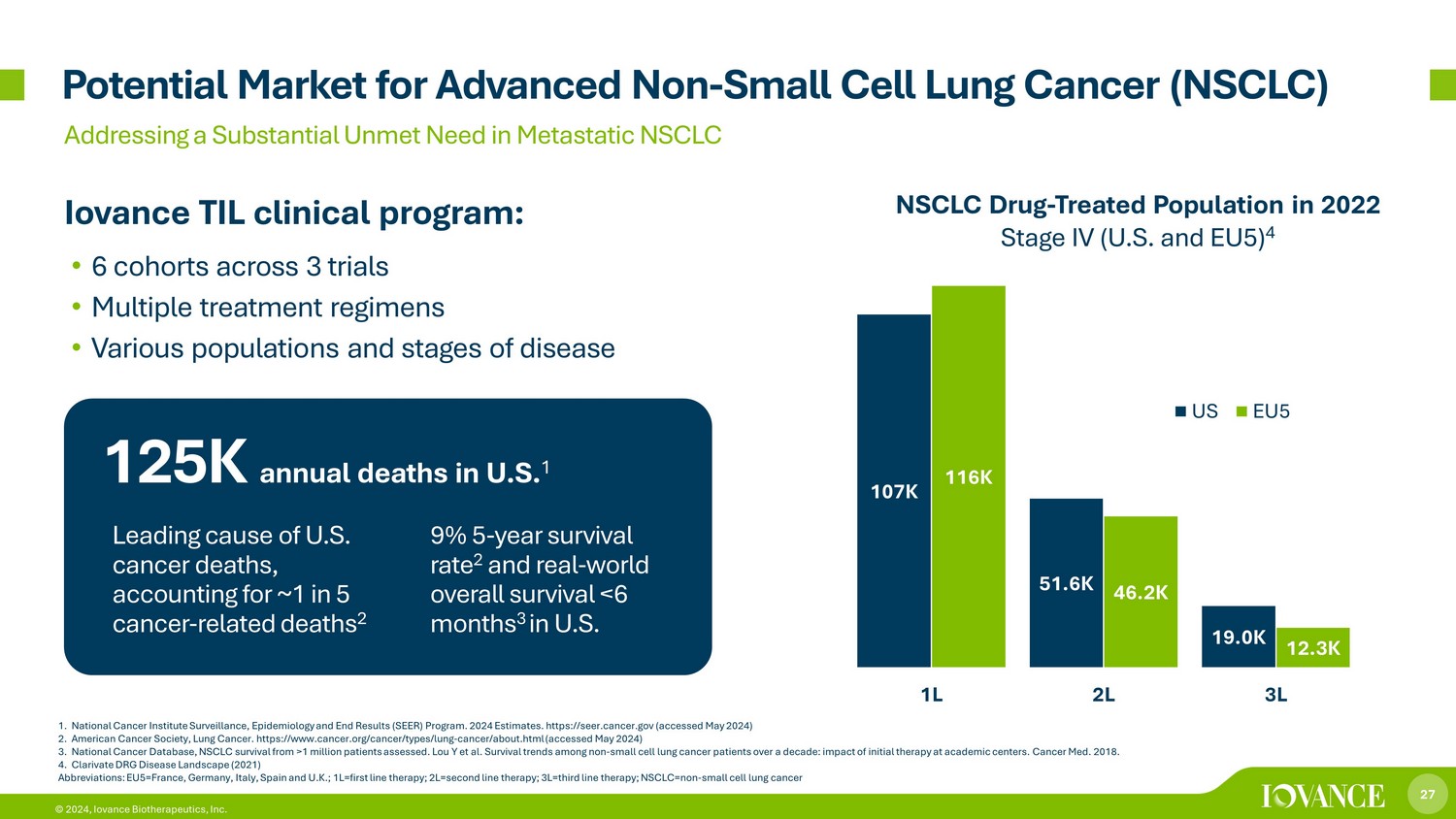 26 © 2024, Iovance Biotherapeutics, Inc. 1. National Cancer Institute Surveillance, Epidemiology and End Results (SEER) Program. 2024 Estimates. https://seer.cancer.g ov (accessed May 2024) 2. World Health Organization International Agency for Research on Cancer (IARC). GLOBOCAN 2022 U.S. Deaths 1 Global Deaths 2 Melanoma 8K 59K Lung & Bronchus 125K 1.8M Endometrial 13K 97K 91% of all cancer cases are solid tumors 1 1 .8 M New cases of solid tumors in the U.S. 1 Expand into other indications Significant Market Potential in Solid Tumors and our Key Programs
