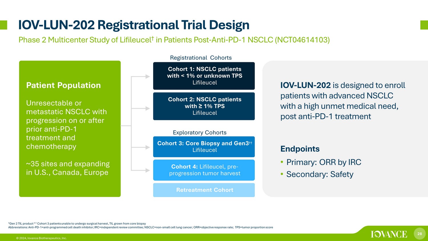 27 © 2024, Iovance Biotherapeutics, Inc. 1. National Cancer Institute Surveillance, Epidemiology and End Results (SEER) Program. 2024 Estimates. https://seer.cancer.gov (accessed May 2024) 2. American Cancer Society, Lung Cancer. https://www.cancer.org/cancer/types/lung - cancer/about.html (accessed May 2024) 3. National Cancer Database, NSCLC survival from >1 million patients assessed. Lou Y et al. Survival trends among non - small cell lu ng cancer patients over a decade: impact of initial therapy at academic centers. Cancer Med. 2018. 4. Clarivate DRG Disease Landscape (2021) Abbreviations: EU5=France, Germany, Italy, Spain and U.K.; 1L=first line therapy; 2L=second line therapy; 3L=third line thera py; NSCLC=non - small cell lung cancer Potential Market for Advanced Non - Small Cell Lung Cancer (NSCLC) Addressing a Substantial Unmet Need in Metastatic NSCLC Iovance TIL clinical program: • 6 cohorts across 3 trials • Multiple treatment regimens • Various populations and stages of disease 125K annual deaths in U.S. 1 107K 51.6K 19.0K 116K 46.2K 12.3K 1L 2L 3L US EU5 NSCLC Drug - Treated Population in 2022 Stage IV (U.S. and EU5) 4 Leading cause of U.S. cancer deaths, accounting for ~1 in 5 cancer - related deaths 2 9% 5 - year survival rate 2 and real - world overall survival <6 months 3 in U.S.