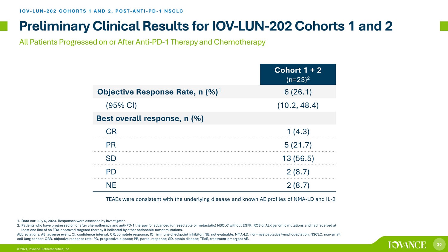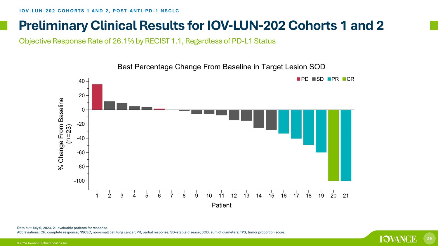 29 © 2024, Iovance Biotherapeutics, Inc. Objective Response Rate of 26.1% by RECIST 1.1, Regardless of PD - L1 Status Preliminary Clinical Results for IOV - LUN - 202 Cohorts 1 and 2 IOV - LUN - 202 COHORTS 1 AND 2, POST - ANTI - PD - 1 NSCLC Data cut: July 6, 2023. 21 evaluable patients for response. Abbreviations: CR, complete response; NSCLC, non - small cell lung cancer; PR, partial response; SD=stable disease; SOD, sum of di ameters; TPS, tumor proportion score. n