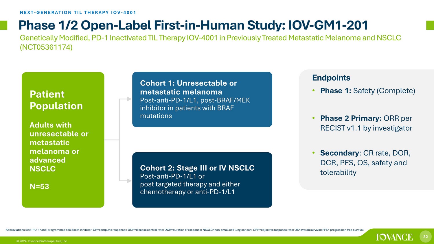 31 © 2024, Iovance Biotherapeutics, Inc. All Responses Remain Ongoing at Time of Data Cut Data cut: July 6, 2023. A bar is presented for each patient starting from date of Lifileucel infusion up to date of new anti - cancer therapy, end of asse ssment, death, or data cutoff date, whichever occurs earlier. Abbreviations: CR, complete response; DOR, duration of response; NSCLC, non - small cell lung cancer; PR, partial response. IOV - LUN - 202 COHORTS 1 AND 2, POST - ANTI - PD - 1 NSCLC Preliminary Clinical Results for IOV - LUN - 202 Cohorts 1 and 2