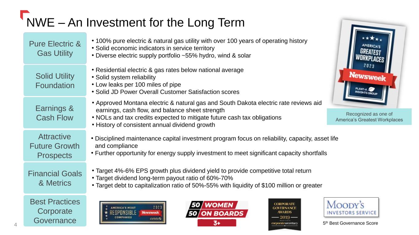 NWE – An Investment for the Long Term 4 • Approved Montana electric & natural gas and South Dakota electric rate reviews aid earnings, cash flow, and balance sheet strength • NOLs and tax credits expected to mitigate future cash tax obligations • History of consistent annual dividend growth • 100% pure electric & natural gas utility with over 100 years of operating history • Solid economic indicators in service territory • Diverse electric supply portfolio ~55% hydro, wind & solar Pure Electric & Gas Utility Solid Utility Foundation Earnings & Cash Flow Attractive Future Growth Prospects Financial Goals & Metrics Best Practices Corporate Governance • Residential electric & gas rates below national average • Solid system reliability • Low leaks per 100 miles of pipe • Solid JD Power Overall Customer Satisfaction scores • Disciplined maintenance capital investment program focus on reliability, capacity, asset life and compliance • Further opportunity for energy supply investment to meet significant capacity shortfalls • Target 4%-6% EPS growth plus dividend yield to provide competitive total return • Target dividend long-term payout ratio of 60%-70% • Target debt to capitalization ratio of 50%-55% with liquidity of $100 million or greater 5th Best Governance Score Recognized as one of America’s Greatest Workplaces