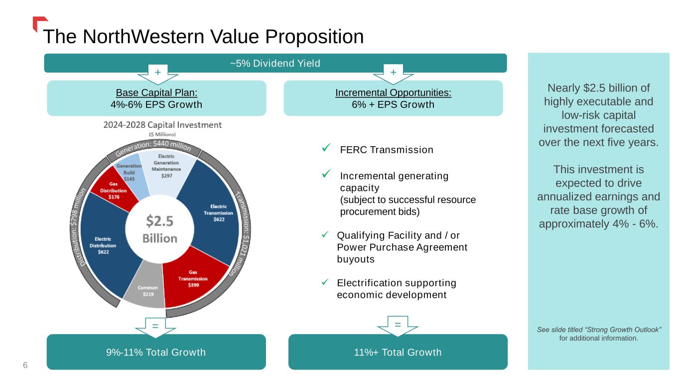 About NorthWestern 5 Montana Operations Electric 405,500 customers 25,274 miles – transmission & distribution lines 887 MW maximum capacity owned power generation Natural Gas 212,100 customers 7,390 miles of transmission and distribution pipeline 17.85 Bcf of gas storage capacity Own 31.5 Bcf of proven natural gas reserves Nebraska Operations Natural Gas 43,100 customers 826 miles of distribution pipeline Data as of 12/31/2023 South Dakota Operations Electric 64,800 customers 3,675 miles – transmission & distribution lines 446 MW nameplate owned power generation Natural Gas 49,800 customers 1,802 miles of transmission and distribution pipeline