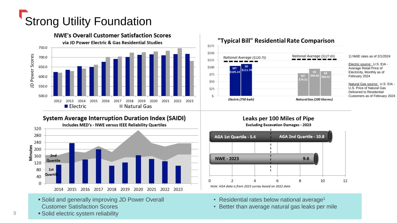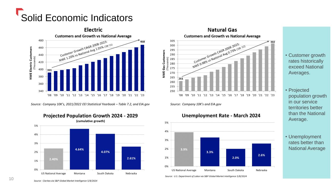 Strong Utility Foundation 9 Solid and generally improving JD Power Overall Customer Satisfaction Scores Solid electric system reliability • Residential rates below national average1 • Better than average natural gas leaks per mile 1) NWE rates as of 2/1/2024 Electric source: U.S. EIA - Average Retail Price of Electricity, Monthly as of February 2024 Natural Gas source: U.S. EIA - U.S. Price of Natural Gas Delivered to Residential Customers as of February 2024