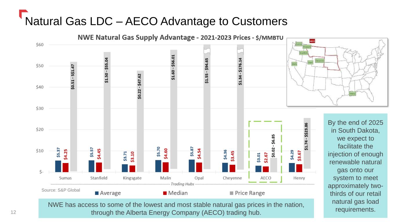 NorthWestern’s Combo-Advantage 11 Combination electric & natural gas provider in Montana & South Dakota • Targeting best-in-class Customer Experience • Opportunity to invest in critical Capacity expansion (supply & transmission) • Continued Grid Evolution to improve resiliency and enhance wildfire mitigation efforts • Transforming our Digital Platform to enhance cyber-security & technology solutions Natural hedge between natural gas to electric conversions Primarily residential with commercial & industrial customers across many industries • Investment in production*, transmission & distribution • Extreme winters necessitate economical gas heating • Energy Choice (Ban the Ban) laws in MT & SD • Access to low & less volatile natural gas pricing • AECO & Henry Hub (Ventura) *Proven and producing reserves only (no exploration) • Investment in generation, transmission & distribution • Highly diverse & carbon-free electric supply portfolio • Broad footprint spanning multiple reliability & transmission regions / organizations • Growing regional capacity deficit requiring investment ElectricNatural Gas