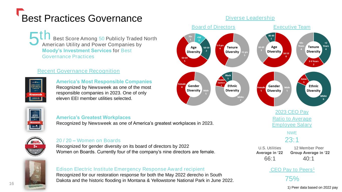 Best Practices Governance 16 America’s Most Responsible Companies Recognized by Newsweek as one of the most responsible companies in 2023. One of only eleven EEI member utilities selected. Board of Directors Executive Team 5th Best Score Among 50 Publicly Traded North American Utility and Power Companies by Moody’s Investment Services for Best Governance Practices Diverse Leadership 2023 CEO Pay Ratio to Average Employee Salary NWE 23:1 U.S. Utilities 12 Member Peer Average in ‘22 Group Average in ‘22 66:1 40:1 CEO Pay to Peers1 75% Recent Governance Recognition America’s Greatest Workplaces Recognized by Newsweek as one of America’s greatest workplaces in 2023. 20 / 20 – Women on Boards Recognized for gender diversity on its board of directors by 2022 Women on Boards. Currently four of the company’s nine directors are female. Edison Electric Institute Emergency Response Award recipient Recognized for our restoration response for both the May 2022 derecho in South Dakota and the historic flooding in Montana & Yellowstone National Park in June 2022. 1) Peer data based on 2022 pay