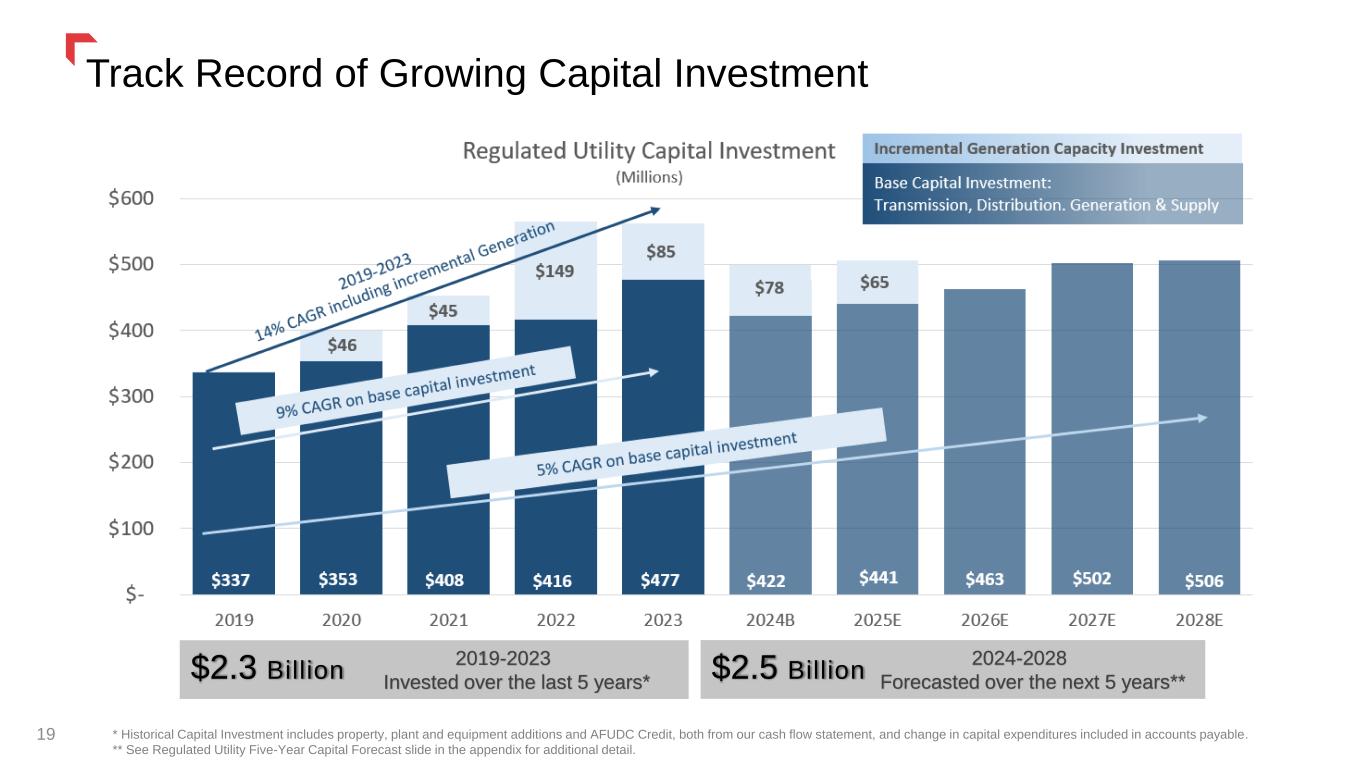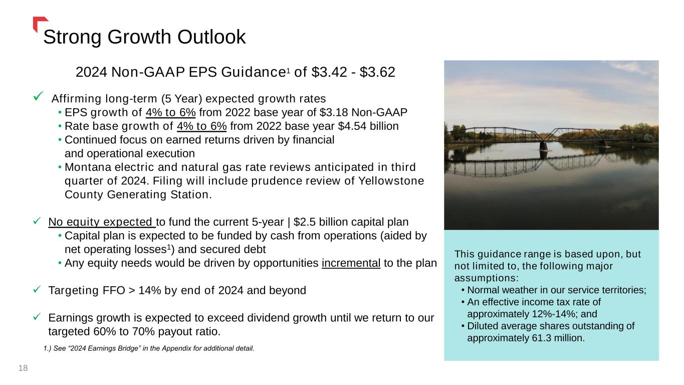 Strong Growth Outlook This guidance range is based upon, but not limited to, the following major assumptions: • Normal weather in our service territories; • An effective income tax rate of approximately 12%-14%; and • Diluted average shares outstanding of approximately 61.3 million. 2024 Non-GAAP EPS Guidance1 of $3.42 - $3.62 Affirming long-term (5 Year) expected growth rates • EPS growth of 4% to 6% from 2022 base year of $3.18 Non-GAAP • Rate base growth of 4% to 6% from 2022 base year $4.54 billion • Continued focus on earned returns driven by financial and operational execution • Montana electric and natural gas rate reviews anticipated in third quarter of 2024. Filing will include prudence review of Yellowstone County Generating Station. No equity expected to fund the current 5-year | $2.5 billion capital plan • Capital plan is expected to be funded by cash from operations (aided by net operating losses1) and secured debt • Any equity needs would be driven by opportunities incremental to the plan Targeting FFO > 14% by end of 2024 and beyond Earnings growth is expected to exceed dividend growth until we return to our targeted 60% to 70% payout ratio. 18 1.) See “2024 Earnings Bridge” in the Appendix for additional detail.