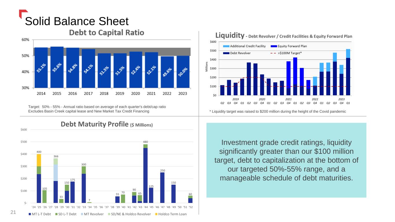 Credit, Cash Flow and Financing Plans 20 Credit Ratings 2024 Financing Plan No equity expected to fund the current 5-year | $2.5 billion capital plan Financing plans (targeting a FFO to Debt ratio > 14%) are expected to maintain our current credit ratings. We expect to pay minimal cash taxes into 2028 due to utilization of our NOL’s and tax credits. Financing plans are subject to change.