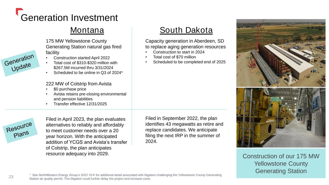 22 Disciplined Expense Program Source: FERC Form 1 Reports - 2023 expenses and company filings through S&P Global IQ. Electric Non-Fuel O&M excludes fuel and steam costs for power generation, water costs for hydro operations, and purchased power cost unless identified in company disclosures. Electric employees are allocated by electric rate base weighting to total rate base. Per Customer… Per Employee… Per Rate Base… NorthWestern maintains best-in-class expense efficiency among our regional peers.