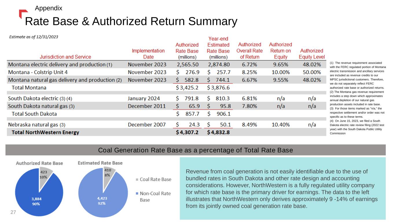 (1) The revenue requirement associated with the FERC regulated portion of Montana electric transmission and ancillary services are included as revenue credits to our MPSC jurisdictional customers. Therefore, we do not separately reflect FERC authorized rate base or authorized returns. (2) The Montana gas revenue requirement includes a step down which approximates annual depletion of our natural gas production assets included in rate base. (3) For those items marked as "n/a," the respective settlement and/or order was not specific as to these terms. (4) On June 15, 2023, we filed a South Dakota electric rate review filing (2022 test year) with the South Dakota Public Utility Commission Coal Generation Rate Base as a percentage of Total Rate Base Revenue from coal generation is not easily identifiable due to the use of bundled rates in South Dakota and other rate design and accounting considerations. However, NorthWestern is a fully regulated utility company for which rate base is the primary driver for earnings. The data to the left illustrates that NorthWestern only derives approximately 9 -14% of earnings from its jointly owned coal generation rate base. Rate Base & Authorized Return Summary Appendix 27