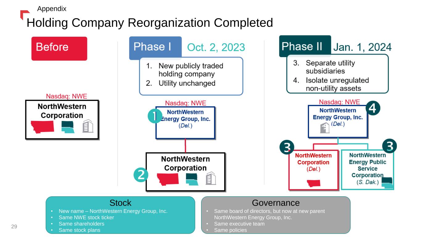 Holding Company Reorganization Completed 29 Stock • New name – NorthWestern Energy Group, Inc. • Same NWE stock ticker • Same shareholders • Same stock plans Governance • Same board of directors, but now at new parent NorthWestern Energy Group, Inc. • Same executive team • Same policies Appendix