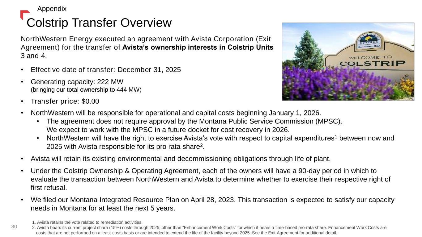Colstrip Transfer Overview NorthWestern Energy executed an agreement with Avista Corporation (Exit Agreement) for the transfer of Avista’s ownership interests in Colstrip Units 3 and 4. • Effective date of transfer: December 31, 2025 • Generating capacity: 222 MW (bringing our total ownership to 444 MW) • Transfer price: $0.00 • NorthWestern will be responsible for operational and capital costs beginning January 1, 2026. • The agreement does not require approval by the Montana Public Service Commission (MPSC). We expect to work with the MPSC in a future docket for cost recovery in 2026. • NorthWestern will have the right to exercise Avista’s vote with respect to capital expenditures1 between now and 2025 with Avista responsible for its pro rata share2. • Avista will retain its existing environmental and decommissioning obligations through life of plant. • Under the Colstrip Ownership & Operating Agreement, each of the owners will have a 90-day period in which to evaluate the transaction between NorthWestern and Avista to determine whether to exercise their respective right of first refusal. • We filed our Montana Integrated Resource Plan on April 28, 2023. This transaction is expected to satisfy our capacity needs in Montana for at least the next 5 years. 1. Avista retains the vote related to remediation activities. 2. Avista bears its current project share (15%) costs through 2025, other than “Enhancement Work Costs” for which it bears a time-based pro-rata share. Enhancement Work Costs are costs that are not performed on a least-costs basis or are intended to extend the life of the facility beyond 2025. See the Exit Agreement for additional detail. 30 Appendix