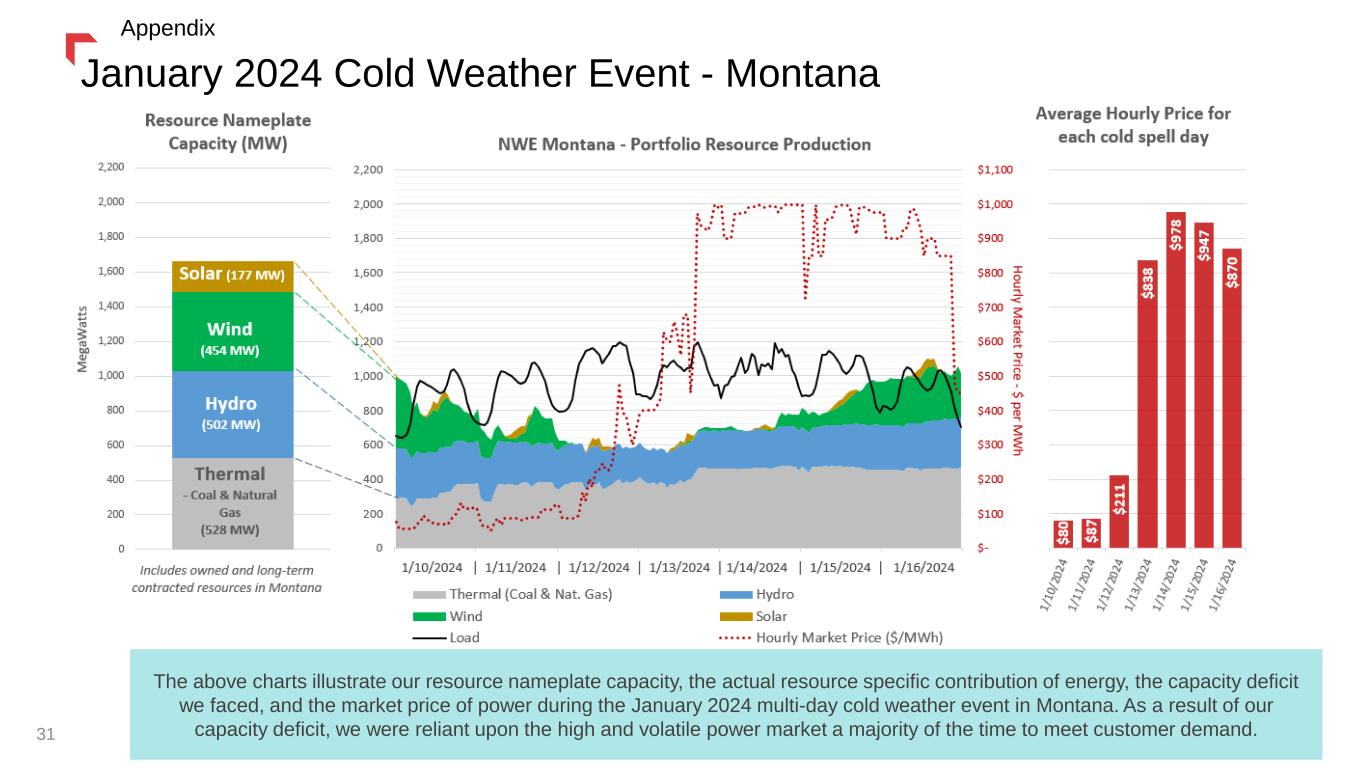 January 2024 Cold Weather Event - Montana 31 The above charts illustrate our resource nameplate capacity, the actual resource specific contribution of energy, the capacity deficit we faced, and the market price of power during the January 2024 multi-day cold weather event in Montana. As a result of our capacity deficit, we were reliant upon the high and volatile power market a majority of the time to meet customer demand. Appendix