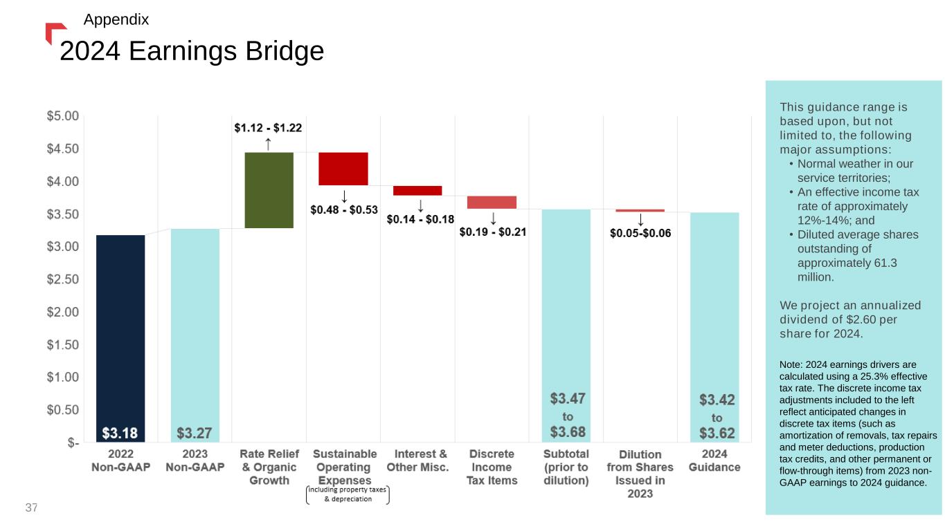 2024 Earnings Bridge This guidance range is based upon, but not limited to, the following major assumptions: • Normal weather in our service territories; • An effective income tax rate of approximately 12%-14%; and • Diluted average shares outstanding of approximately 61.3 million. We project an annualized dividend of $2.60 per share for 2024. 37 Note: 2024 earnings drivers are calculated using a 25.3% effective tax rate. The discrete income tax adjustments included to the left reflect anticipated changes in discrete tax items (such as amortization of removals, tax repairs and meter deductions, production tax credits, and other permanent or flow-through items) from 2023 non- GAAP earnings to 2024 guidance. Appendix