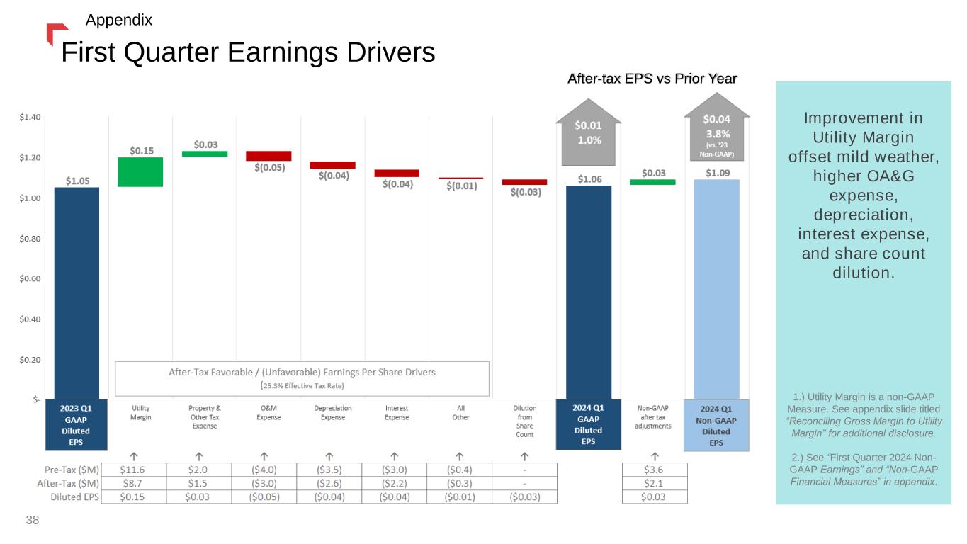 After-tax EPS vs Prior Year First Quarter Earnings Drivers 38 1 2 Improvement in Utility Margin offset mild weather, higher OA&G expense, depreciation, interest expense, and share count dilution. 1.) Utility Margin is a non-GAAP Measure. See appendix slide titled “Reconciling Gross Margin to Utility Margin” for additional disclosure. 2.) See “First Quarter 2024 Non- GAAP Earnings” and “Non-GAAP Financial Measures” in appendix. Appendix