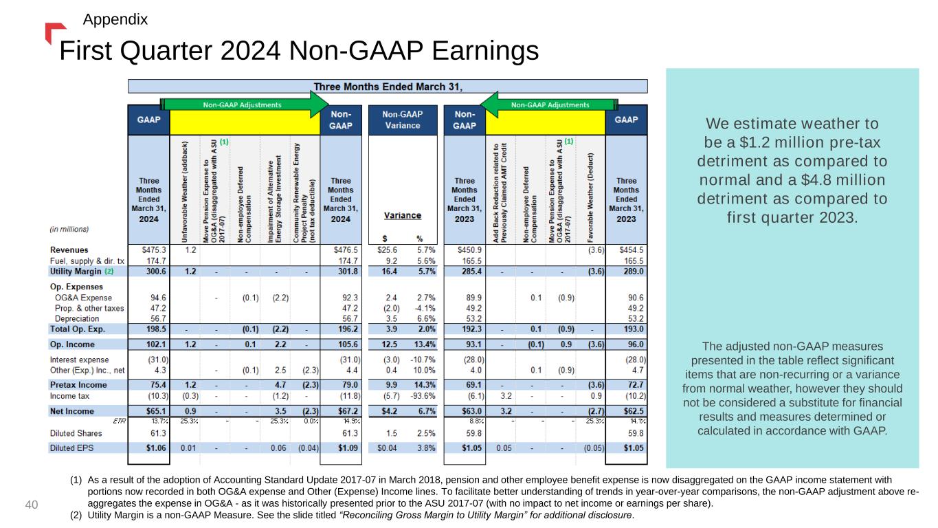 (in millions except per share amounts) 2024 2023 Variance % Variance Operating Revenues 475.3$ 454.5$ 20.8$ 4.6% 174.7 165.5 9.2 5.6% Utility Margin 300.6 289.0 11.6 4.0% Operating Expenses Operating and maintenance 54.2 55.9 (1.7) (3.0%) Administrative and general 40.4 34.7 5.7 16.4% Property and other taxes 47.2 49.2 (2.0) (4.1%) Depreciation and depletion 56.7 53.2 3.5 6.6% Total Operating Expenses 198.5 193.0 5.5 2.8% Operating Income 102.1 96.0 6.1 6.4% Interest expense (31.0) (28.0) (3.0) (10.7%) Other income, net 4.3 4.7 (0.4) (8.5%) Income Before Taxes 75.4 72.7 2.7 3.7% Income tax expense (10.3) (10.2) (0.1) (1.0%) Net Income 65.1$ 62.5$ 2.6$ 4.2% Effective Tax Rate 13.7% 14.1% (0.4%) Diluted Shares Outstanding 61.3 59.8 1.5 2.5% Diluted Earnings Per Share $1.06 $1.05 0.01$ 1.0% Dividends Paid per Common Share 0.65$ 0.64$ 0.01$ 1.6% Three Months Ended March 31, Fuel, purchased supply & direct transmission expense (exclusive of depreciation and depletion) 1 First Quarter Financial Results 39 1.) Utility Margin is a non- GAAP Measure. See appendix slide titled “Reconciling Gross Margin to Utility Margin” for additional disclosure. Appendix