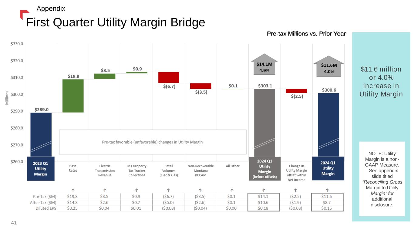 (1) As a result of the adoption of Accounting Standard Update 2017-07 in March 2018, pension and other employee benefit expense is now disaggregated on the GAAP income statement with portions now recorded in both OG&A expense and Other (Expense) Income lines. To facilitate better understanding of trends in year-over-year comparisons, the non-GAAP adjustment above re- aggregates the expense in OG&A - as it was historically presented prior to the ASU 2017-07 (with no impact to net income or earnings per share). (2) Utility Margin is a non-GAAP Measure. See the slide titled “Reconciling Gross Margin to Utility Margin” for additional disclosure. First Quarter 2024 Non-GAAP Earnings 40 We estimate weather to be a $1.2 million pre-tax detriment as compared to normal and a $4.8 million detriment as compared to first quarter 2023. The adjusted non-GAAP measures presented in the table reflect significant items that are non-recurring or a variance from normal weather, however they should not be considered a substitute for financial results and measures determined or calculated in accordance with GAAP. Appendix