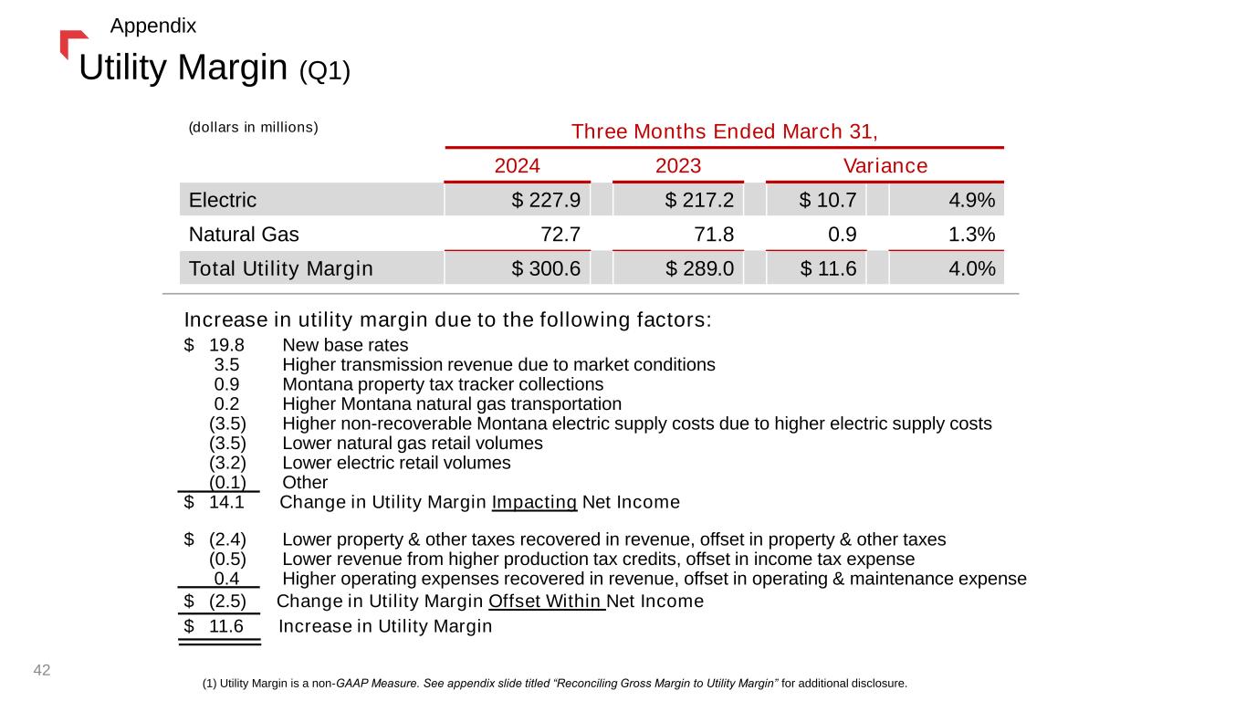 First Quarter Utility Margin Bridge Pre-tax Millions vs. Prior Year $11.6 million or 4.0% increase in Utility Margin NOTE: Utility Margin is a non- GAAP Measure. See appendix slide titled “Reconciling Gross Margin to Utility Margin” for additional disclosure. 41 Appendix