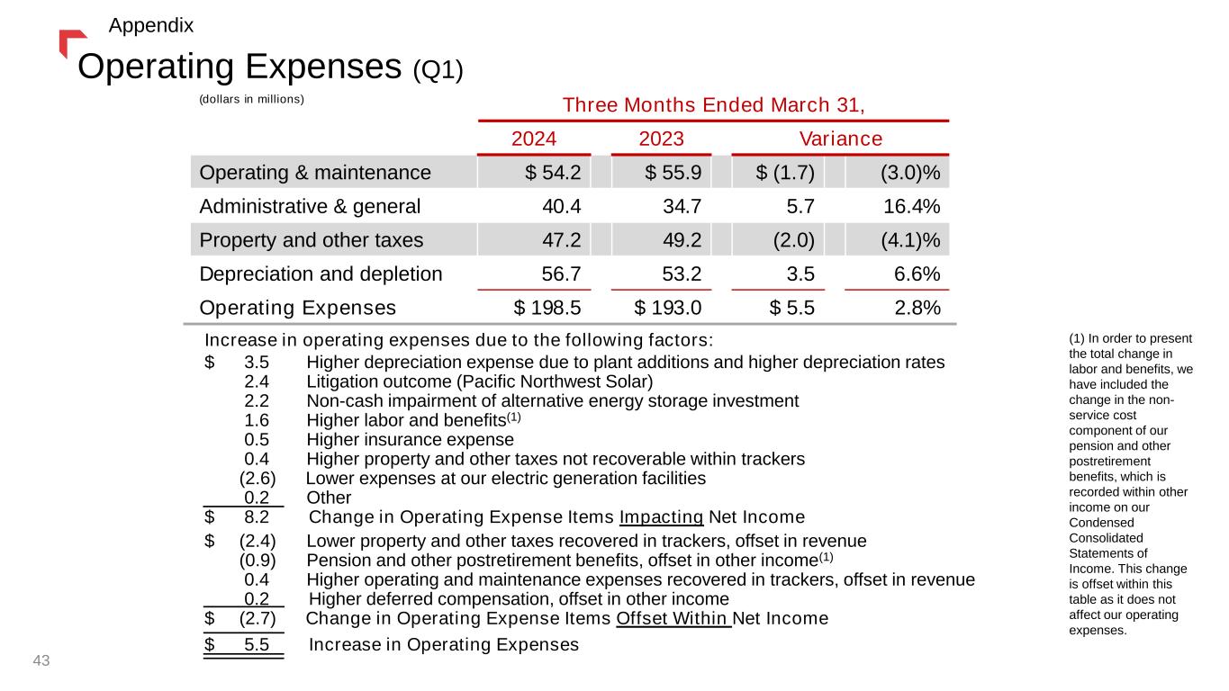 Operating Expenses (Q1) Increase in operating expenses due to the following factors: $ 3.5 Higher depreciation expense due to plant additions and higher depreciation rates 2.4 Litigation outcome (Pacific Northwest Solar) 2.2 Non-cash impairment of alternative energy storage investment 1.6 Higher labor and benefits(1) 0.5 Higher insurance expense 0.4 Higher property and other taxes not recoverable within trackers (2.6) Lower expenses at our electric generation facilities 0.2 Other $ 8.2 Change in Operating Expense Items Impacting Net Income (dollars in millions) Three Months Ended March 31, 2024 2023 Variance Operating & maintenance $ 54.2 $ 55.9 $ (1.7) (3.0)% Administrative & general 40.4 34.7 5.7 16.4% Property and other taxes 47.2 49.2 (2.0) (4.1)% Depreciation and depletion 56.7 53.2 3.5 6.6% Operating Expenses $ 198.5 $ 193.0 $ 5.5 2.8% $ (2.4) Lower property and other taxes recovered in trackers, offset in revenue (0.9) Pension and other postretirement benefits, offset in other income(1) 0.4 Higher operating and maintenance expenses recovered in trackers, offset in revenue 0.2 Higher deferred compensation, offset in other income $ (2.7) Change in Operating Expense Items Offset Within Net Income $ 5.5 Increase in Operating Expenses (1) In order to present the total change in labor and benefits, we have included the change in the non- service cost component of our pension and other postretirement benefits, which is recorded within other income on our Condensed Consolidated Statements of Income. This change is offset within this table as it does not affect our operating expenses. 43 Appendix