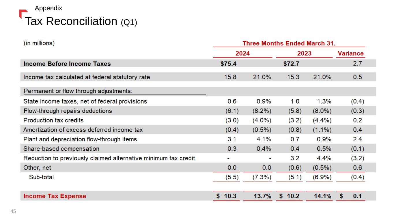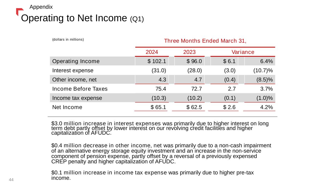 Operating to Net Income (Q1) (dollars in millions) Three Months Ended March 31, 2024 2023 Variance Operating Income $ 102.1 $ 96.0 $ 6.1 6.4% Interest expense (31.0) (28.0) (3.0) (10.7)% Other income, net 4.3 4.7 (0.4) (8.5)% Income Before Taxes 75.4 72.7 2.7 3.7% Income tax expense (10.3) (10.2) (0.1) (1.0)% Net Income $ 65.1 $ 62.5 $ 2.6 4.2% $3.0 million increase in interest expenses was primarily due to higher interest on long term debt partly offset by lower interest on our revolving credit facilities and higher capitalization of AFUDC. $0.4 million decrease in other income, net was primarily due to a non-cash impairment of an alternative energy storage equity investment and an increase in the non-service component of pension expense, partly offset by a reversal of a previously expensed CREP penalty and higher capitalization of AFUDC. $0.1 million increase in income tax expense was primarily due to higher pre-tax income.44 Appendix