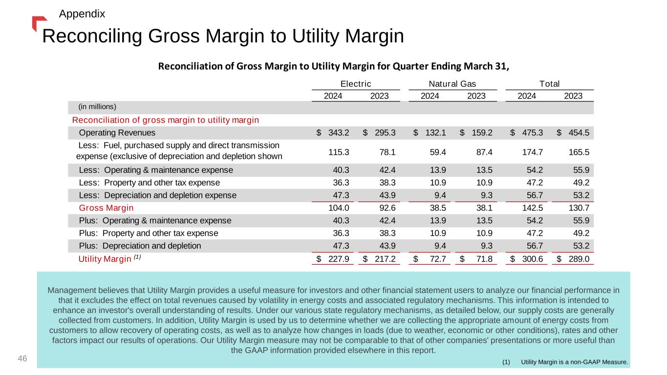 Reconciling Gross Margin to Utility Margin Management believes that Utility Margin provides a useful measure for investors and other financial statement users to analyze our financial performance in that it excludes the effect on total revenues caused by volatility in energy costs and associated regulatory mechanisms. This information is intended to enhance an investor's overall understanding of results. Under our various state regulatory mechanisms, as detailed below, our supply costs are generally collected from customers. In addition, Utility Margin is used by us to determine whether we are collecting the appropriate amount of energy costs from customers to allow recovery of operating costs, as well as to analyze how changes in loads (due to weather, economic or other conditions), rates and other factors impact our results of operations. Our Utility Margin measure may not be comparable to that of other companies' presentations or more useful than the GAAP information provided elsewhere in this report. (1) Utility Margin is a non-GAAP Measure. 46 Appendix 2024 2023 2024 2023 2024 2023 (in millions) Reconciliation of gross margin to utility margin Operating Revenues 343.2$ 295.3$ 132.1$ 159.2$ 475.3$ 454.5$ Less: Fuel, purchased supply and direct transmission expense (exclusive of depreciation and depletion shown separately below) 115.3 78.1 59.4 87.4 174.7 165.5 Less: Operating & maintenance expense 40.3 42.4 13.9 13.5 54.2 55.9 Less: Property and other tax expense 36.3 38.3 10.9 10.9 47.2 49.2 Less: Depreciation and depletion expense 47.3 43.9 9.4 9.3 56.7 53.2 Gross Margin 104.0 92.6 38.5 38.1 142.5 130.7 Plus: Operating & maintenance expense 40.3 42.4 13.9 13.5 54.2 55.9 Plus: Property and other tax expense 36.3 38.3 10.9 10.9 47.2 49.2 Plus: Depreciation and depletion 47.3 43.9 9.4 9.3 56.7 53.2 Utility Margin 227.9$ 217.2$ 72.7$ 71.8$ 300.6$ 289.0$ Reconciliation of Gross Margin to Utility Margin for Quarter Ending March 31, Electric Natural Gas Total (1)