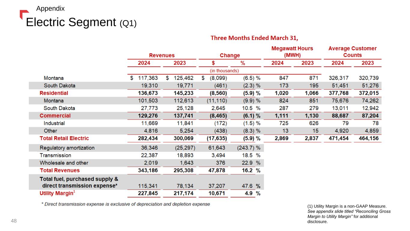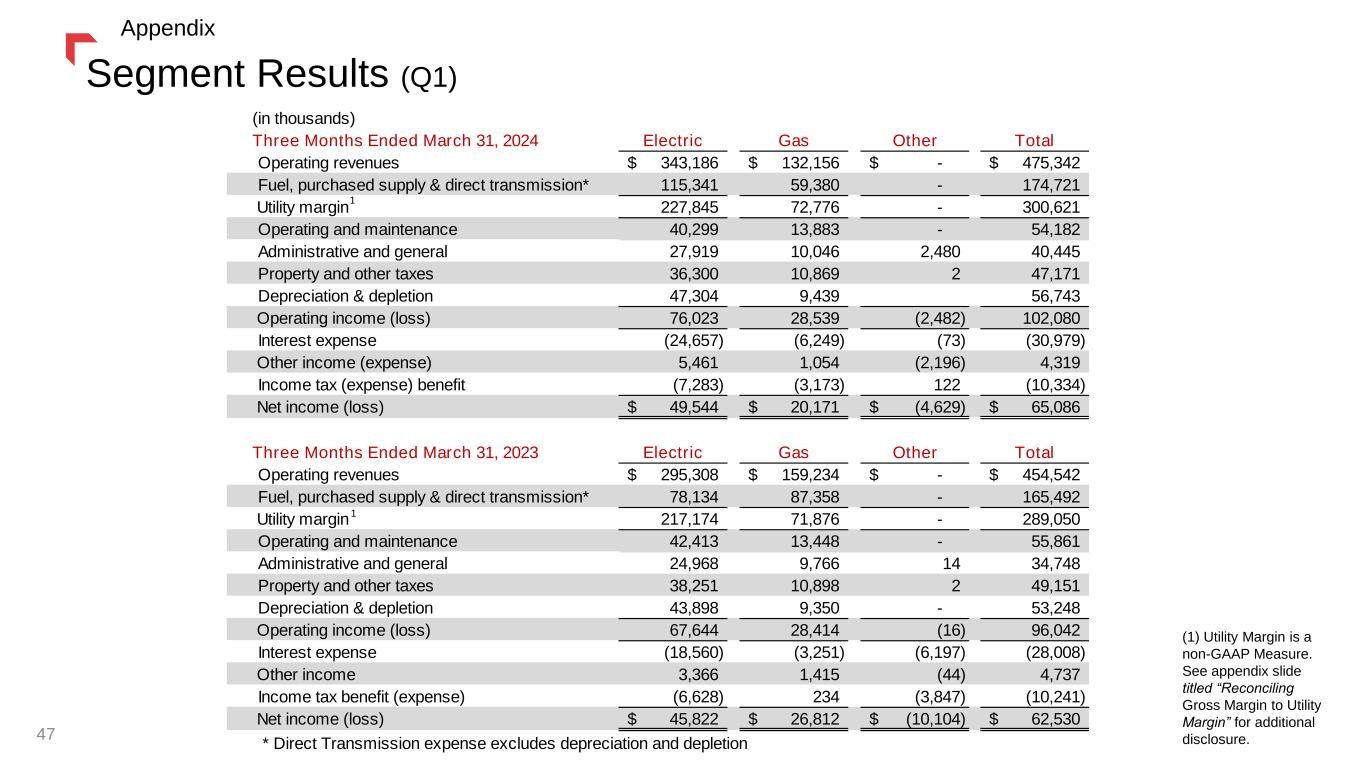 Segment Results (Q1) (1) Utility Margin is a non-GAAP Measure. See appendix slide titled “Reconciling Gross Margin to Utility Margin” for additional disclosure. 47 Appendix Three Months Ended March 31, 2024 Electric Gas Other Total Operating revenues 343,186$ 132,156$ -$ 475,342$ Fuel, purchased supply & direct transmission* 115,341 59,380 - 174,721 Utility margin 227,845 72,776 - 300,621 Operating and maintenance 40,299 13,883 - 54,182 Administrative and general 27,919 10,046 2,480 40,445 Property and other taxes 36,300 10,869 2 47,171 Depreciation & depletion 47,304 9,439 56,743 Operating income (loss) 76,023 28,539 (2,482) 102,080 Interest expense (24,657) (6,249) (73) (30,979) Other income (expense) 5,461 1,054 (2,196) 4,319 Income tax (expense) benefit (7,283) (3,173) 122 (10,334) Net income (loss) 49,544$ 20,171$ (4,629)$ 65,086$ Three Months Ended March 31, 2023 Electric Gas Other Total Operating revenues 295,308$ 159,234$ -$ 454,542$ Fuel, purchased supply & direct transmission* 78,134 87,358 - 165,492 Utility margin 217,174 71,876 - 289,050 Operating and maintenance 42,413 13,448 - 55,861 Administrative and general 24,968 9,766 14 34,748 Property and other taxes 38,251 10,898 2 49,151 Depreciation & depletion 43,898 9,350 - 53,248 Operating income (loss) 67,644 28,414 (16) 96,042 Interest expense (18,560) (3,251) (6,197) (28,008) Other income 3,366 1,415 (44) 4,737 Income tax benefit (expense) (6,628) 234 (3,847) (10,241) Net income (loss) 45,822$ 26,812$ (10,104)$ 62,530$ * Direct Transmission expense excludes depreciation and depletion (in thousands) 1 1