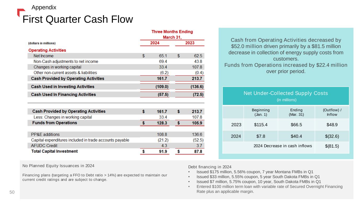 Cash from Operating Activities decreased by $52.0 million driven primarily by a $81.5 million decrease in collection of energy supply costs from customers. Funds from Operations increased by $22.4 million over prior period. Net Under-Collected Supply Costs (in millions) Beginning (Jan. 1) Ending (Mar. 31) (Outflow) / Inflow 2023 $115.4 $66.5 $48.9 2024 $7.8 $40.4 $(32.6) 2024 Decrease in cash inflows $(81.5) No Planned Equity Issuances in 2024 Financing plans (targeting a FFO to Debt ratio > 14%) are expected to maintain our current credit ratings and are subject to change. Debt financing in 2024 • Issued $175 million, 5.56% coupon, 7 year Montana FMBs in Q1 • Issued $33 million, 5.55% coupon, 5 year South Dakota FMBs in Q1 • Issued $7 million, 5.75% coupon, 10 year, South Dakota FMBs in Q1 • Entered $100 million term loan with variable rate of Secured Overnight Financing Rate plus an applicable margin. First Quarter Cash Flow 50 Appendix