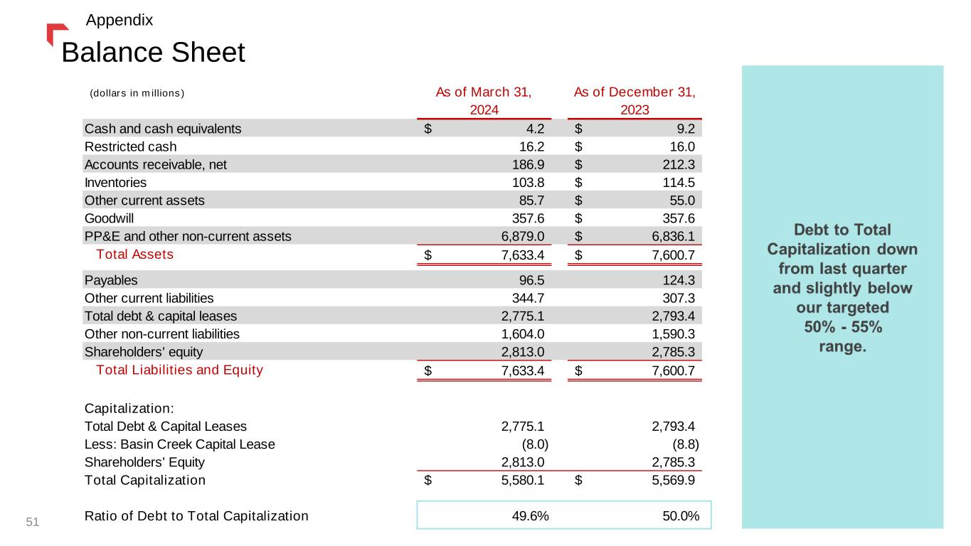 (dollars in millions) As of March 31, As of December 31, 2024 2023 Cash and cash equivalents 4.2$ 9.2$ Restricted cash 16.2 16.0$ Accounts receivable, net 186.9 212.3$ Inventories 103.8 114.5$ Other current assets 85.7 55.0$ Goodwill 357.6 357.6$ PP&E and other non-current assets 6,879.0 6,836.1$ Total Assets 7,633.4$ 7,600.7$ Payables 96.5 124.3 Other current liabilities 344.7 307.3 Total debt & capital leases 2,775.1 2,793.4 Other non-current liabilities 1,604.0 1,590.3 Shareholders' equity 2,813.0 2,785.3 Total Liabilities and Equity 7,633.4$ 7,600.7$ Capitalization: Total Debt & Capital Leases 2,775.1 2,793.4 Less: Basin Creek Capital Lease (8.0) (8.8) Shareholders' Equity 2,813.0 2,785.3 Total Capitalization 5,580.1$ 5,569.9$ Ratio of Debt to Total Capitalization 49.6% 50.0% Balance Sheet 51 Appendix