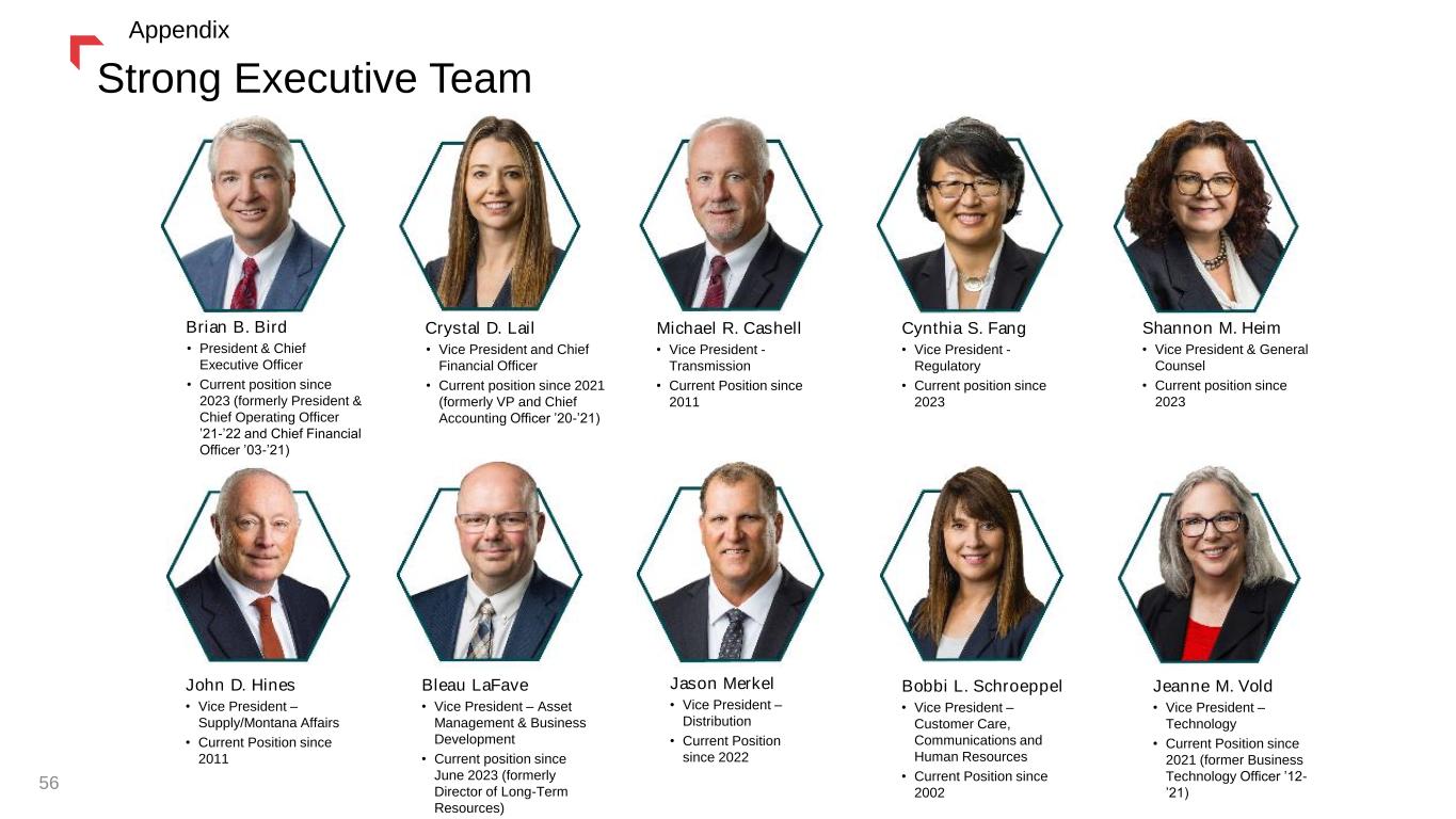 Strong Executive Team 56 Brian B. Bird • President & Chief Executive Officer • Current position since 2023 (formerly President & Chief Operating Officer ’21-’22 and Chief Financial Officer ’03-’21) Crystal D. Lail • Vice President and Chief Financial Officer • Current position since 2021 (formerly VP and Chief Accounting Officer ’20-’21) Michael R. Cashell • Vice President - Transmission • Current Position since 2011 Cynthia S. Fang • Vice President - Regulatory • Current position since 2023 Shannon M. Heim • Vice President & General Counsel • Current position since 2023 Bobbi L. Schroeppel • Vice President – Customer Care, Communications and Human Resources • Current Position since 2002 Bleau LaFave • Vice President – Asset Management & Business Development • Current position since June 2023 (formerly Director of Long-Term Resources) Jason Merkel • Vice President – Distribution • Current Position since 2022 John D. Hines • Vice President – Supply/Montana Affairs • Current Position since 2011 Jeanne M. Vold • Vice President – Technology • Current Position since 2021 (former Business Technology Officer ’12- ’21) Appendix