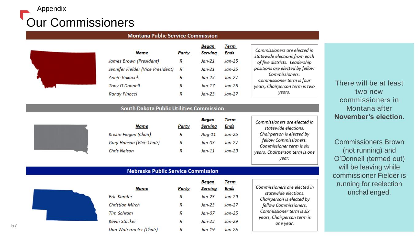 Our Commissioners 57 Appendix There will be at least two new commissioners in Montana after November’s election. Commissioners Brown (not running) and O’Donnell (termed out) will be leaving while commissioner Fielder is running for reelection unchallenged.