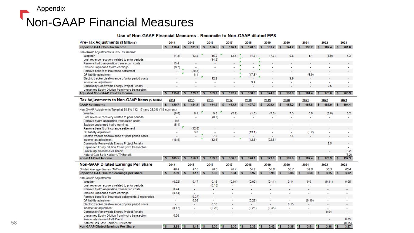 Non-GAAP Financial Measures This presentation includes financial information prepared in accordance with GAAP, as well as other financial measures, such as Utility Margin, Adjusted Non-GAAP pretax income, Adjusted Non-GAAP net income and Adjusted Non-GAAP Diluted EPS that are considered “non-GAAP financial measures.” Generally, a non-GAAP financial measure is a numerical measure of a company’s financial performance, financial position or cash flows that excludes (or includes) amounts that are included in (or excluded from) the most directly comparable measure calculated and presented in accordance with GAAP. We define Utility Margin as Operating Revenues less fuel, purchased supply and direct transmission expense (exclusive of depreciation and depletion) as presented in our Consolidated Statements of Income. This measure differs from the GAAP definition of Gross Margin due to the exclusion of Operating and maintenance, Property and other taxes, and Depreciation and depletion expenses, which are presented separately in our Consolidated Statements of Income. A reconciliation of Utility Margin to Gross Margin, the most directly comparable GAAP measure, is included in this presentation. Management believes that Utility Margin provides a useful measure for investors and other financial statement users to analyze our financial performance in that it excludes the effect on total revenues caused by volatility in energy costs and associated regulatory mechanisms. This information is intended to enhance an investor's overall understanding of results. Under our various state regulatory mechanisms, as detailed below, our supply costs are generally collected from customers. In addition, Utility Margin is used by us to determine whether we are collecting the appropriate amount of energy costs from customers to allow recovery of operating costs, as well as to analyze how changes in loads (due to weather, economic or other conditions), rates and other factors impact our results of operations. Our Utility Margin measure may not be comparable to that of other companies' presentations or more useful than the GAAP information provided elsewhere in this report. Management also believes the presentation of Adjusted Non-GAAP pre-tax income, Adjusted Non-GAAP net income and Adjusted Non-GAAP Diluted EPS is more representative of normal earnings than GAAP pre-tax income, net income and EPS due to the exclusion (or inclusion) of certain impacts that are not reflective of ongoing earnings. The presentation of these non-GAAP measures is intended to supplement investors' understanding of our financial performance and not to replace other GAAP measures as an indicator of actual operating performance. Our measures may not be comparable to other companies' similarly titled measures. 59 Appendix