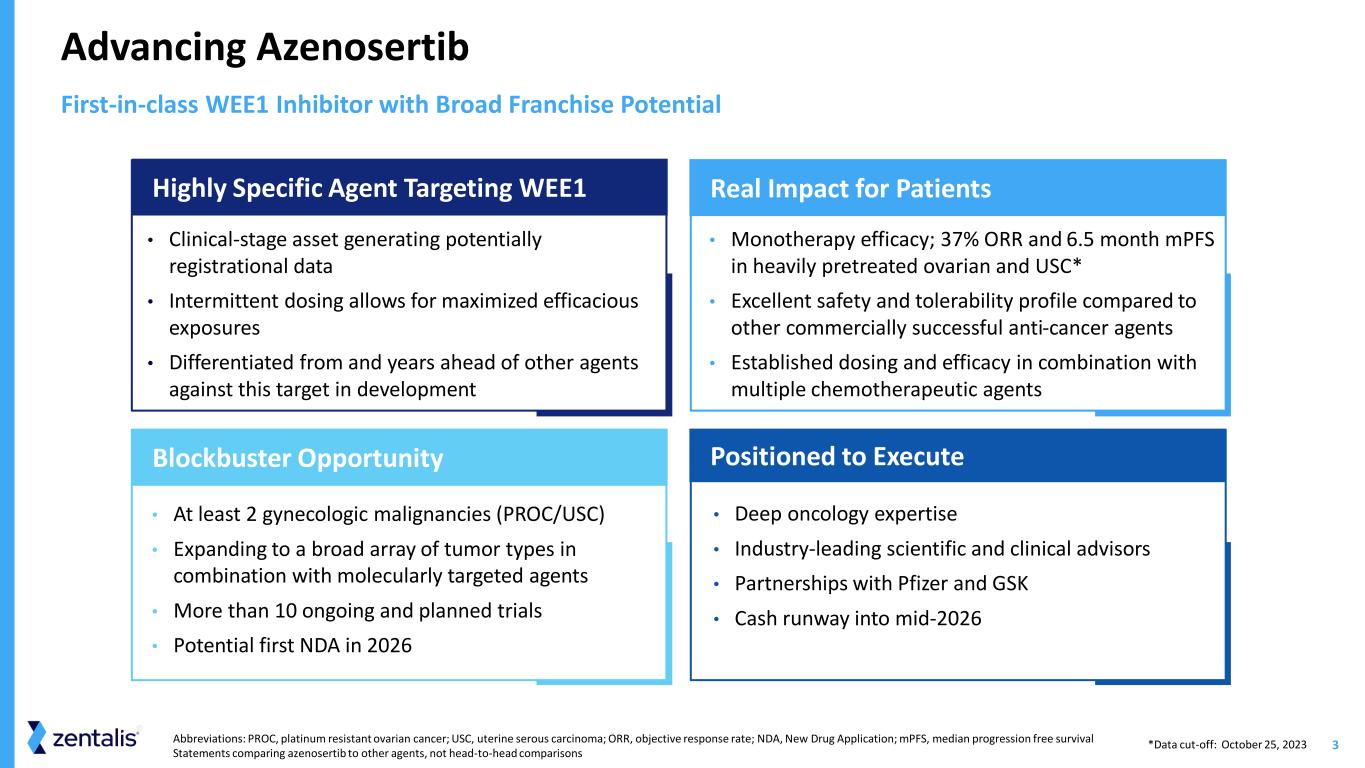 2 Forward Looking Statements and Disclaimer Zentalis Pharmaceuticals, Inc. (“we,” “us,” “our,” “Zentalis” or the “Company”) cautions that this presentation (including oral commentary that accompanies this presentation) contains forward-looking statements within the meaning of the U.S. Private Securities Litigation Reform Act of 1995. All statements contained in this presentation that do not relate to matters of historical fact should be considered forward-looking statements, including without limitation statements regarding the potential for azenosertib (ZN-c3) to be first-in-class and best-in-class; the potential for azenosertib to be a blockbuster opportunity; the potential applicability of azenosertib to a broad array of tumor types, including in combination with molecularly targeted agents; the potential timing of filing our first New Drug Application for azenosertib; potential for azenosertib to have real impact for patients; our positioning to execute; our projected cash runway; our development approach for our product candidates; planned clinical trials for our product candidates, including our strategy with respect to azenosertib in platinum sensitive ovarian cancer; the potential that we are generating registrational data; the potential of azenosertib to address large unmet need across a broad array of tumor types; the potential for studies to be registrational; the potential and suitability of azenosertib to address tumors with high genomic instability; the opportunity for azenosertib in first-line maintenance in homologous repair proficient platinum sensitive ovarian cancer; the opportunity for a monotherapy approval of azenosertib in platinum resistant ovarian cancer; our strategy for azenosertib development and the potential benefits thereof, including in platinum sensitive ovarian cancer; the potential for our development approach in platinum sensitive ovarian cancer to be practice changing; pursuit of a fast-to-market strategy for azenosertib; the potential for azenosertib to provide prolonged benefit for the greatest number of ovarian cancer patients in the first-line maintenance setting; the potential for CCNE1 amplification and Cyclin E1 IHC as potential patient enrichment strategies; the opportunity to address unmet need in relapsed or refractory acute myeloid leukemia by combining azenosertib and ZN-d5; the potential for building the azenosertib franchise, including the potential that the franchise opportunity for azenosertib more than doubles as it expands beyond gynecologic malignancies; the potential unmet need in a particular indication and/or patient population; potential for generating datasets with value-creating potential; potential for combinations including our product candidates and the potential benefits thereof; our potential positioning for success with the azenosertib franchise; the potential benefits of the designs of our product candidates; the target profiles and potential benefits of our product candidates and their mechanisms of action, including as a monotherapy and/or in combination; the market opportunities for and market potential of our product candidates, including the number of potential patients per year; the timing and content of our anticipated milestones, including the timing of initiation of clinical trials and disclosure of clinical data, as well as statements that include the words such as “anticipate,” “building,” "continue," "could," “estimate,” “expect,” “milestone,” “opportunity,” “plan,” “positioned,” “potential,” “predictive,” “strategy,” "support," “will” and similar statements of a future or forward-looking nature. These statements are neither promises nor guarantees, but involve known and unknown risks, uncertainties and other important factors that may cause our actual results, performance or achievements to be materially different from any future results, performance or achievements expressed or implied by the forward-looking statements, including, but not limited to, the following: our limited operating history, which may make it difficult to evaluate our current business and predict our future success and viability; we have and expect to continue to incur significant losses; our need for additional funding, which may not be available; our plans, including the costs thereof, of development of any diagnostic tools; the outcome of preclinical testing and early trials may not be predictive of the success of later clinical trials; failure to identify additional product candidates and develop or commercialize marketable products; potential unforeseen events during clinical trials could cause delays or other adverse consequences; risks relating to the regulatory approval process or ongoing regulatory obligations; failure to obtain U.S. or international marketing approval; our product candidates may cause serious adverse side effects; inability to maintain our collaborations, or the failure of these collaborations; our reliance on third parties; effects of significant competition; the possibility of system failures or security breaches; risks relating to intellectual property; our ability to attract, retain and motivate qualified personnel, and risks relating to management transitions; and significant costs as a result of operating as a public company. Other risks and uncertainties include those identified under the caption “Risk Factors” in our most recently filed periodic reports on Forms 10-K and 10-Q and subsequent filings with the U.S. Securities and Exchange Commission in the future could cause actual results to differ materially from those indicated by the forward-looking statements made in this presentation. Any such forward-looking statements represent management’s estimates as of the date of this presentation. New risks and uncertainties may emerge from time to time, and it is not possible to predict all risks and uncertainties. While we may elect