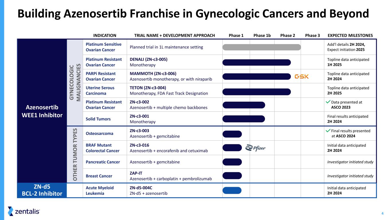 3 First-in-class WEE1 Inhibitor with Broad Franchise Potential Abbreviations: PROC, platinum resistant ovarian cancer; USC, uterine serous carcinoma; ORR, objective response rate; NDA, New Drug Application; mPFS, median progression free survival Statements comparing azenosertib to other agents, not head-to-head comparisons Advancing Azenosertib • Clinical-stage asset generating potentially registrational data • Intermittent dosing allows for maximized efficacious exposures • Differentiated from and years ahead of other agents against this target in development Highly Specific Agent Targeting WEE1 • Monotherapy efficacy; 37% ORR and 6.5 month mPFS in heavily pretreated ovarian and USC* • Excellent safety and tolerability profile compared to other commercially successful anti-cancer agents • Established dosing and efficacy in combination with multiple chemotherapeutic agents Real Impact for Patients • At least 2 gynecologic malignancies (PROC/USC) • Expanding to a broad array of tumor types in combination with molecularly targeted agents • More than 10 ongoing and planned trials • Potential first NDA in 2026 Blockbuster Opportunity • Deep oncology expertise • Industry-leading scientific and clinical advisors • Partnerships with Pfizer and GSK • Cash runway into mid-2026 Positioned to Execute *Data cut-off: October 25, 2023