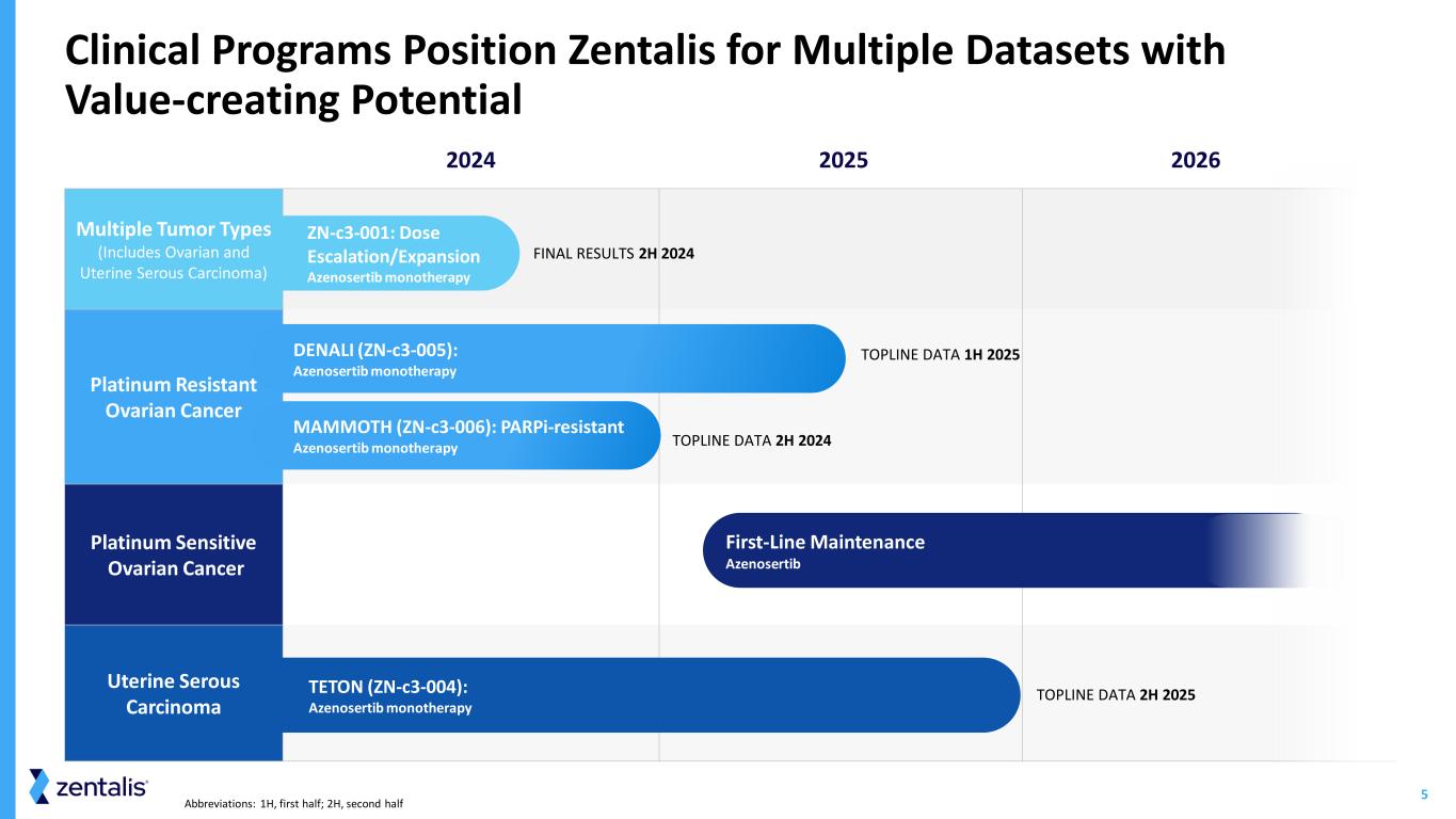 4 Building Azenosertib Franchise in Gynecologic Cancers and Beyond INDICATION TRIAL NAME + DEVELOPMENT APPROACH Phase 1 Phase 1b Phase 2 Phase 3 EXPECTED MILESTONES Azenosertib WEE1 Inhibitor G Y N EC O LO G IC M A LI G N A N C IE S Platinum Sensitive Ovarian Cancer Planned trial in 1L maintenance setting Add’l details 2H 2024, Expect initiation 2025 Platinum Resistant Ovarian Cancer DENALI (ZN-c3-005) Monotherapy Topline data anticipated 1H 2025 PARPi Resistant Ovarian Cancer MAMMOTH (ZN-c3-006) Azenosertib monotherapy, or with niraparib Topline data anticipated 2H 2024 Uterine Serous Carcinoma TETON (ZN-c3-004) Monotherapy, FDA Fast Track Designation Topline data anticipated 2H 2025 Platinum Resistant Ovarian Cancer ZN-c3-002 Azenosertib + multiple chemo backbones Data presented at ASCO 2023 Solid Tumors ZN-c3-001 Monotherapy Final results anticipated 2H 2024 O TH ER T U M O R T Y P ES Osteosarcoma ZN-c3-003 Azenosertib + gemcitabine Final results presented __at ASCO 2024 BRAF Mutant Colorectal Cancer ZN-c3-016 Azenosertib + encorafenib and cetuximab Initial data anticipated 2H 2024 Pancreatic Cancer Azenosertib + gemcitabine Investigator initiated study Breast Cancer ZAP-IT Azenosertib + carboplatin + pembrolizumab Investigator initiated study ZN-d5 BCL-2 Inhibitor Acute Myeloid Leukemia ZN-d5-004C ZN-d5 + azenosertib Initial data anticipated 2H 2024