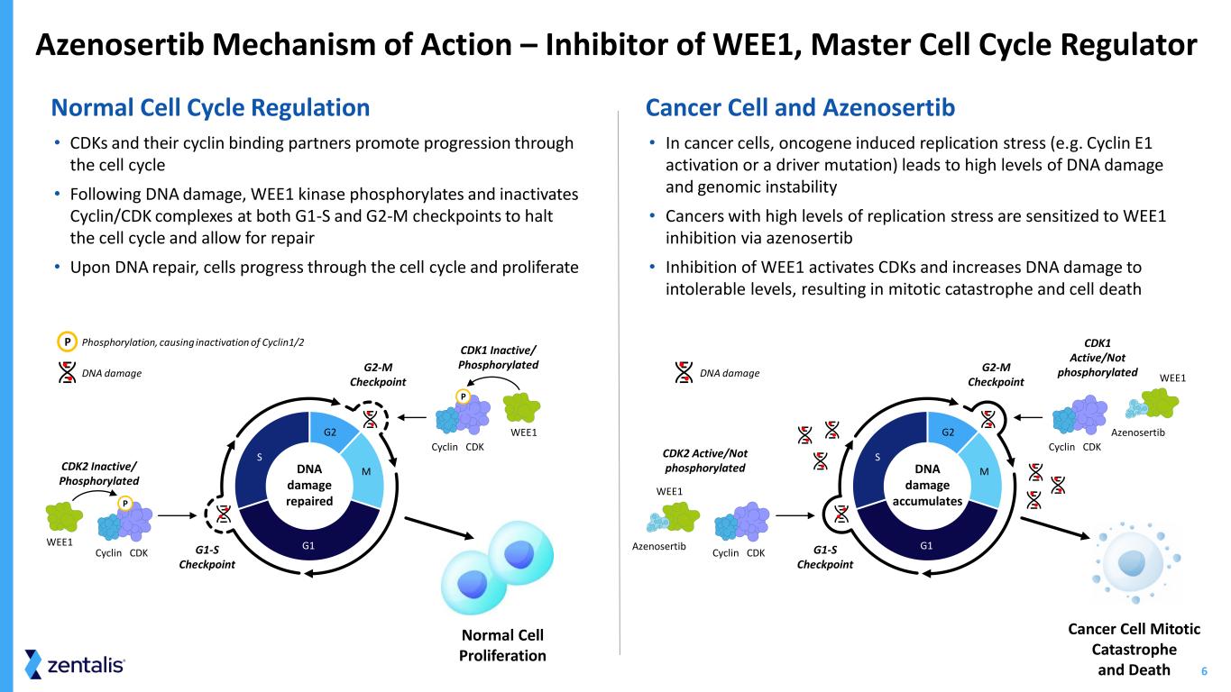 5 2024 2025 2026 Multiple Tumor Types (Includes Ovarian and Uterine Serous Carcinoma) Platinum Resistant Ovarian Cancer Platinum Sensitive Ovarian Cancer Uterine Serous Carcinoma Abbreviations: 1H, first half; 2H, second half Clinical Programs Position Zentalis for Multiple Datasets with Value-creating Potential First-Line Maintenance Azenosertib TOPLINE DATA 1H 2025 TOPLINE DATA 2H 2024 TOPLINE DATA 2H 2025 FINAL RESULTS 2H 2024 DENALI (ZN-c3-005): Azenosertib monotherapy MAMMOTH (ZN-c3-006): PARPi-resistant Azenosertib monotherapy ZN-c3-001: Dose Escalation/Expansion Azenosertib monotherapy TETON (ZN-c3-004): Azenosertib monotherapy