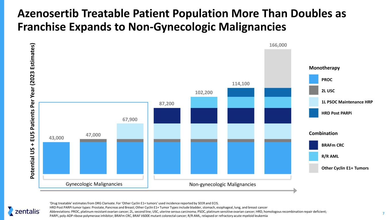6 Normal Cell Cycle Regulation • In cancer cells, oncogene induced replication stress (e.g. Cyclin E1 activation or a driver mutation) leads to high levels of DNA damage and genomic instability • Cancers with high levels of replication stress are sensitized to WEE1 inhibition via azenosertib • Inhibition of WEE1 activates CDKs and increases DNA damage to intolerable levels, resulting in mitotic catastrophe and cell death • CDKs and their cyclin binding partners promote progression through the cell cycle • Following DNA damage, WEE1 kinase phosphorylates and inactivates Cyclin/CDK complexes at both G1-S and G2-M checkpoints to halt the cell cycle and allow for repair • Upon DNA repair, cells progress through the cell cycle and proliferate Cancer Cell and Azenosertib Azenosertib Mechanism of Action – Inhibitor of WEE1, Master Cell Cycle Regulator G1 S G2 M G2-M Checkpoint G1-S Checkpoint DNA damage repaired CDK2 Inactive/ Phosphorylated CDKCyclin WEE1 P CDK1 Inactive/ Phosphorylated CDKCyclin WEE1 Normal Cell Proliferation Phosphorylation, causing inactivation of Cyclin1/2 DNA damage P G1 S G2 M G2-M Checkpoint G1-S Checkpoint DNA damage accumulates Cancer Cell Mitotic Catastrophe and Death DNA damage P CDK2 Active/Not phosphorylated CDKCyclin CDKCyclin Azenosertib WEE1 Azenosertib WEE1 CDK1 Active/Not phosphorylated