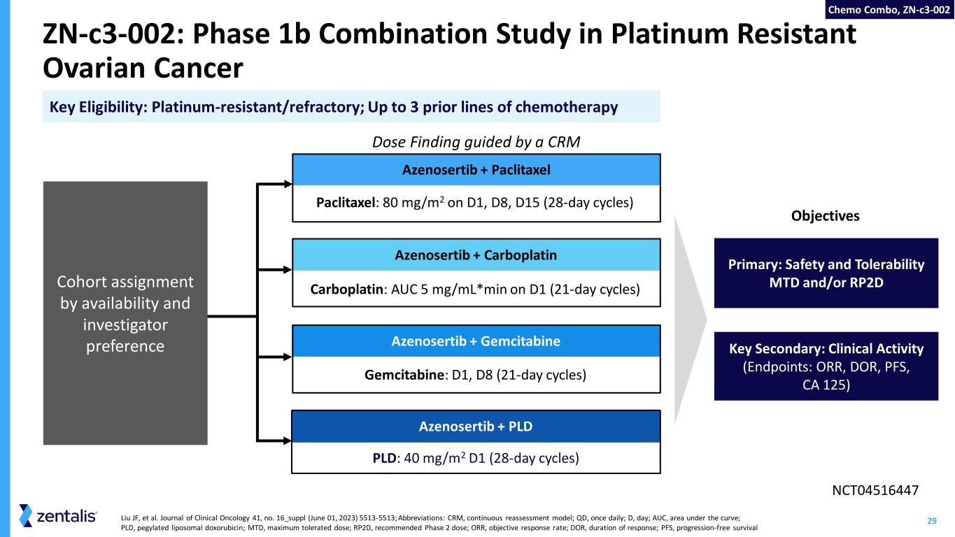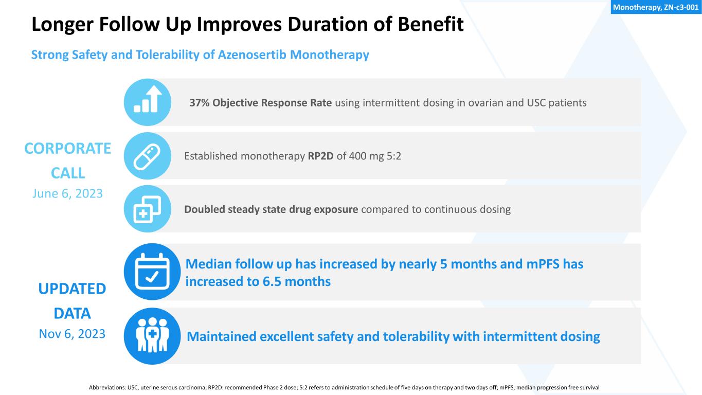 Established monotherapy RP2D of 400 mg 5:2 Median follow up has increased by nearly 5 months and mPFS has increased to 6.5 months 37% Objective Response Rate using intermittent dosing in ovarian and USC patients Maintained excellent safety and tolerability with intermittent dosing CORPORATE CALL June 6, 2023 Strong Safety and Tolerability of Azenosertib Monotherapy Abbreviations: USC, uterine serous carcinoma; RP2D: recommended Phase 2 dose; 5:2 refers to administration schedule of five days on therapy and two days off; mPFS, median progression free survival Longer Follow Up Improves Duration of Benefit Doubled steady state drug exposure compared to continuous dosing UPDATED DATA Nov 6, 2023 Monotherapy, ZN-c3-001