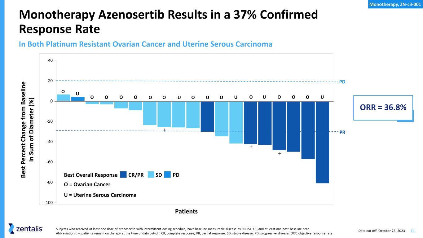 10 Intermittent Monotherapy Patient Population Was Heavily Pretreated and Treatment Refractory USC and HGSOC subjects who received at least one dose of azenosertib with intermittent dosing schedule, have baseline measurable disease by RECIST 1.1, and at least one post-baseline scan. *Platinum Resistant: For USC patients, received prior platinum therapy. For HGSOC patients, progression within 90-180 days of prior dose of a platinum-based regimen in any line of therapy. **Platinum Refractory: Progression within 90 days of prior dose of a platinum-based regimen in any line. Progression date based on progression date if available or start date of next therapy. Abbreviations: USC, uterine serous carcinoma; HGSOC, high grade serous ovarian cancer; PARP, poly-ADP ribose polymerase; VEGF, vascular endothelial growth factor; PD-1/PD-L1, programmed cell death protein 1/programmed death ligand 1. USC HGSOC N=6 N=13 Prior Lines of Treatment Median (Range) 3.5 (1-6) 6 (2-11) Platinum Resistant* (N, %) 5 (83.3) 5 (38.5) Platinum Refractory** (N, %) NA 8 (61.5) Prior Therapies (N, %) Prior PARP Inhibitor 1 (16.7) 10 (76.9) Prior Experimental Agents 0 (0.0) 5 (38.5) Prior VEGF Inhibitor 5 (83.3) 11 (84.6) Prior Anti-PD-1/PD-L1 6 (100) 1 (7.7) Monotherapy, ZN-c3-001