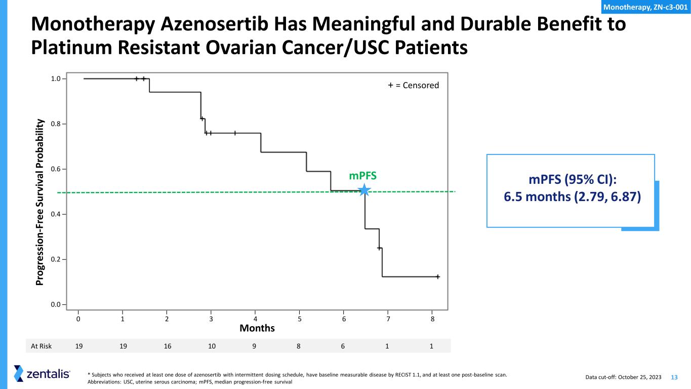 12 Monotherapy Azenosertib Has Meaningful and Durable Benefit to Platinum Resistant Ovarian Cancer/USC Patients * Subjects who received at least one dose of azenosertib with intermittent dosing schedule, have baseline measurable disease by RECIST 1.1, and at least one post-baseline scan. Abbreviations: PROC, platinum resistant ovarian cancer; USC, uterine serous carcinoma; CR, complete response; PR, partial response; SD, stable disease; PD, progressive disease; Platinum Refractory: Progression within 90 days of last dose of a platinum-based regimen in any line. 0 1 2 3 4 5 6 7 8 9 10 11 12 13 Treatment Duration (months) Data cut-off: October 25, 2023 R Best Overall Response CR/PR SD PD Platinum Refractory Ovarian Cancer O = Ovarian Cancer U = Uterine Serous Carcinoma R Monotherapy, ZN-c3-001 R R R R R R R R O O O O U U O O U O U O O O O U O O U